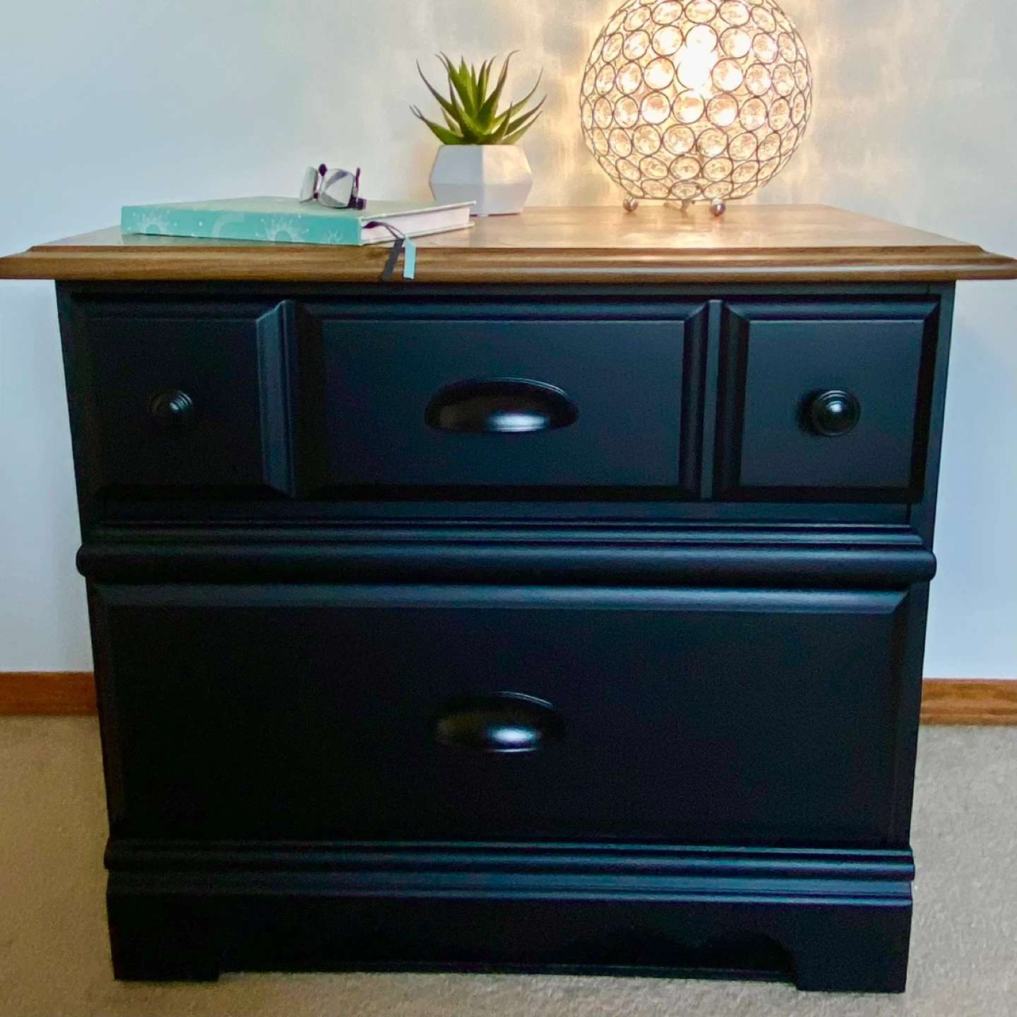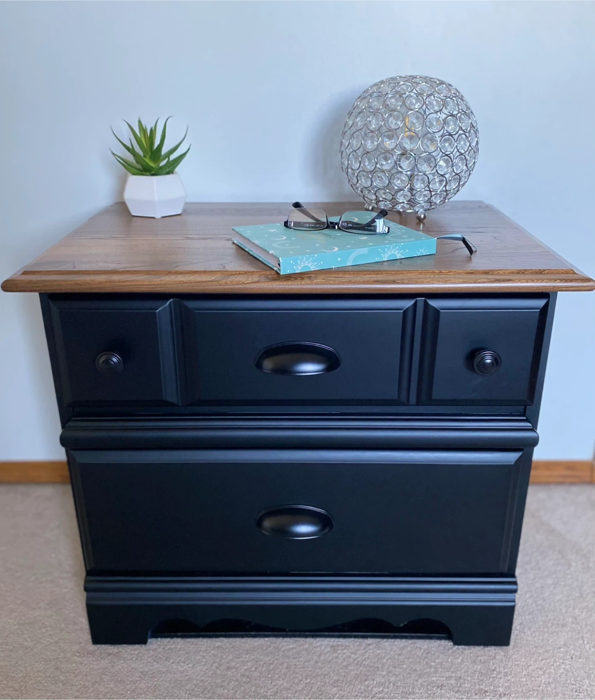 This piece features: • A matte black body for a sleek modern look • A natural walnut top, professionally stained and sealed to highlight the beautiful wood grain • Durable finish using high-quality materials for long-lasting use • Stylish yet versatile design that fits perfectly in bedrooms, living rooms, or entryways ✅ Solid wood (not veneer or particle board) ✅ Professionally refinished – ready to use ✅ Neutral design works with rustic, modern, or farmhouse interiors 📍 Located in Calgary. 🚗 Delivery available for a small fee! 📏 Dimensions. 15 x 24 x 22.5