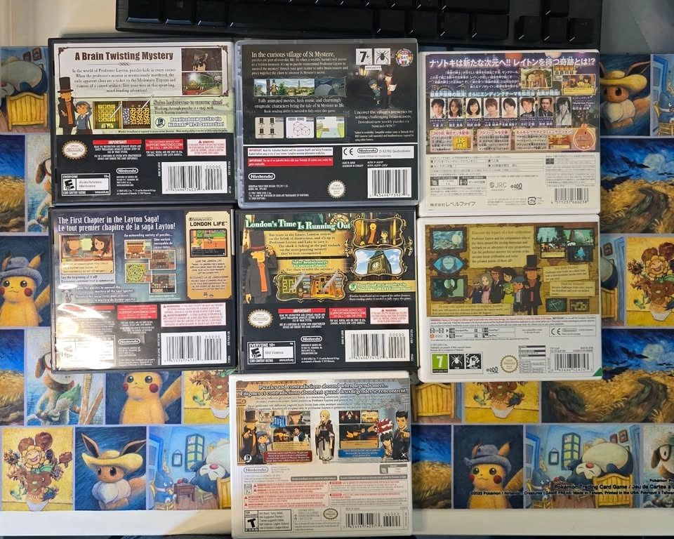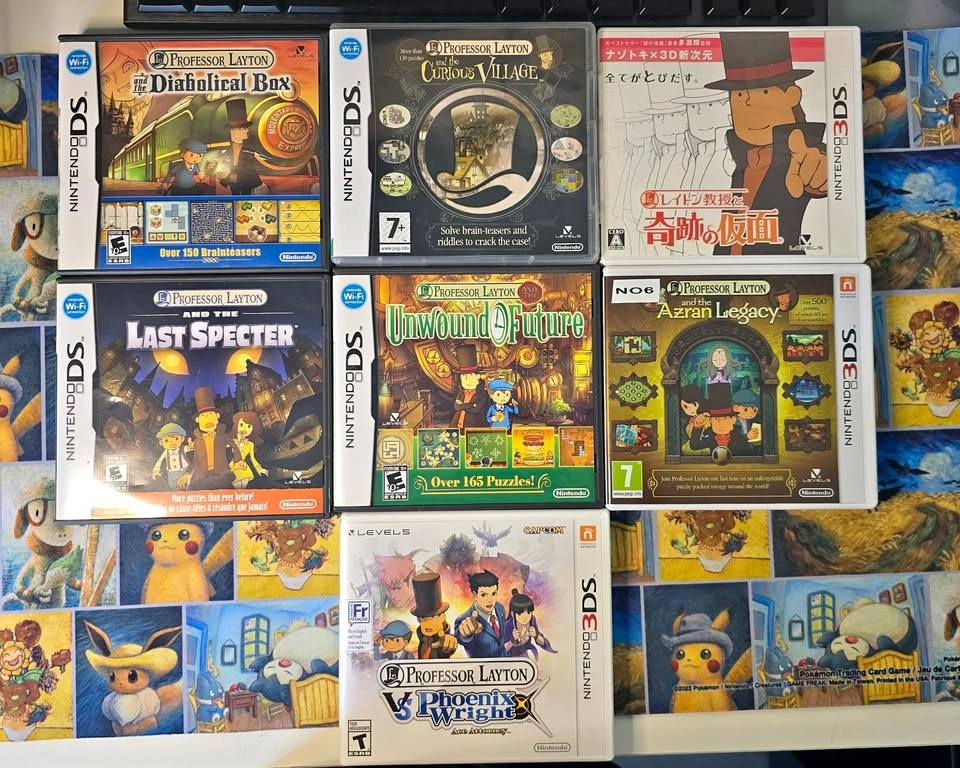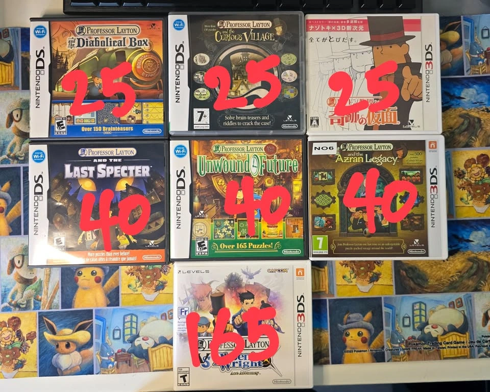 All games are COMPLETE IN BOX - Manual, inserts, etc. Selling my collection of Professor Layton Games. The costs are on the second picture. The price is firm if buying one piece. Offer is welcome on multiple purchase. Please note of the versions/region: Diabolical Box - NA $25 Curious Village - EUR $25 Miracle Mask - JPN $25 Last Specter - NA $40 Unwound Future - NA $40 Azran Legacy - EUR $40 Professor Layton vs Phoenix Wright - NA $165 Langley or Port Coquitlam