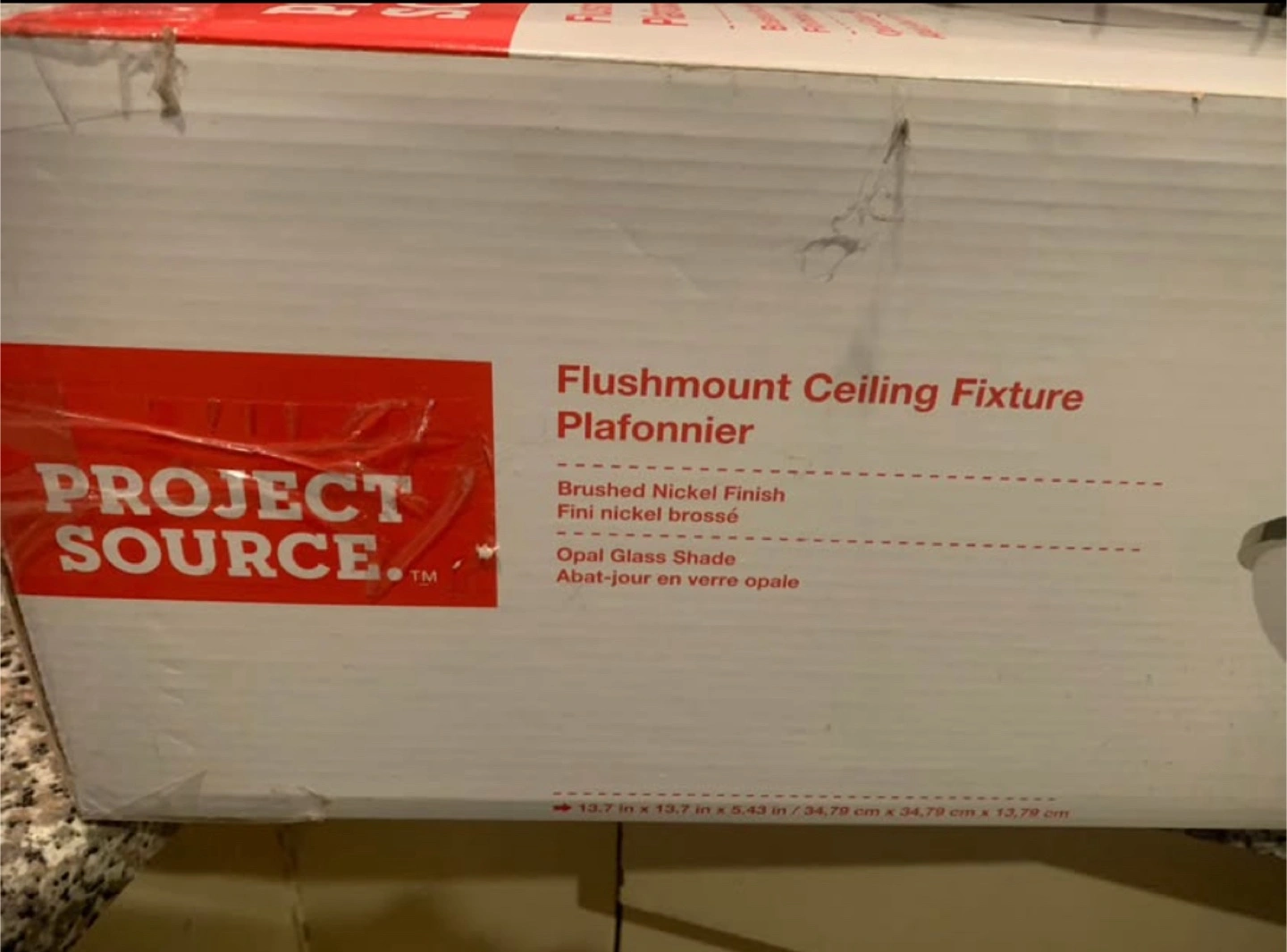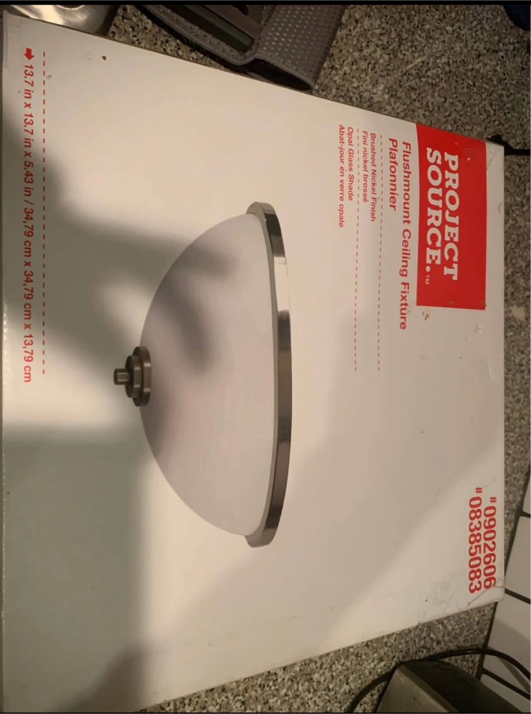 Selling a Project Source flushmount ceiling fixture. It features a brushed nickel finish and an opal glass shade. Dimensions: 13.7 in x 13.7 in x 5.43 in / 34.79 cm x 34.79 cm x 13.79 cm Box is included!