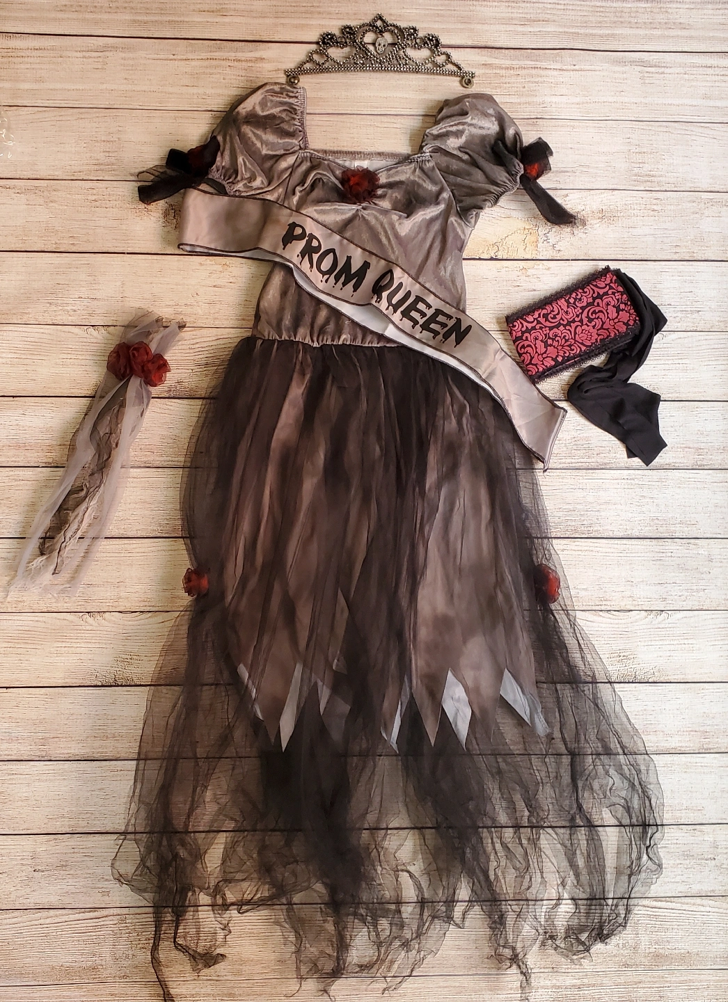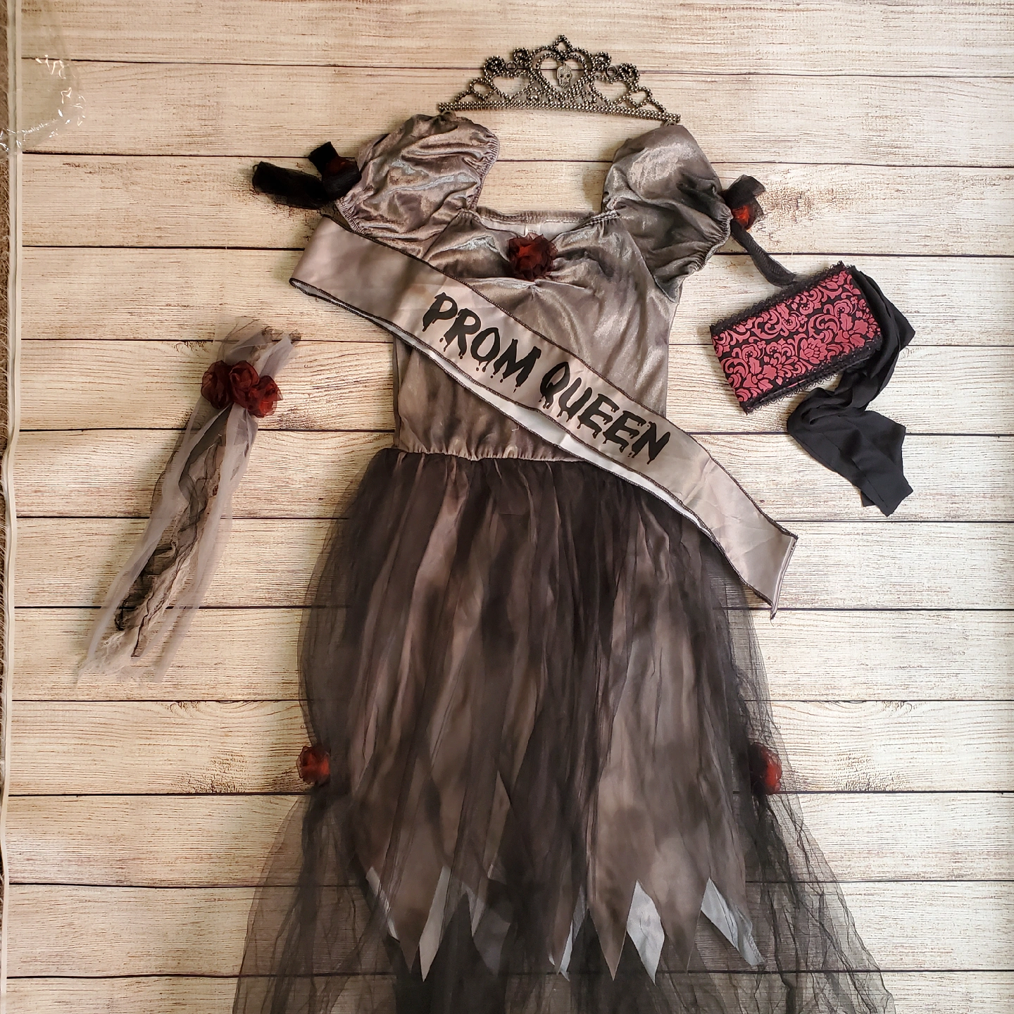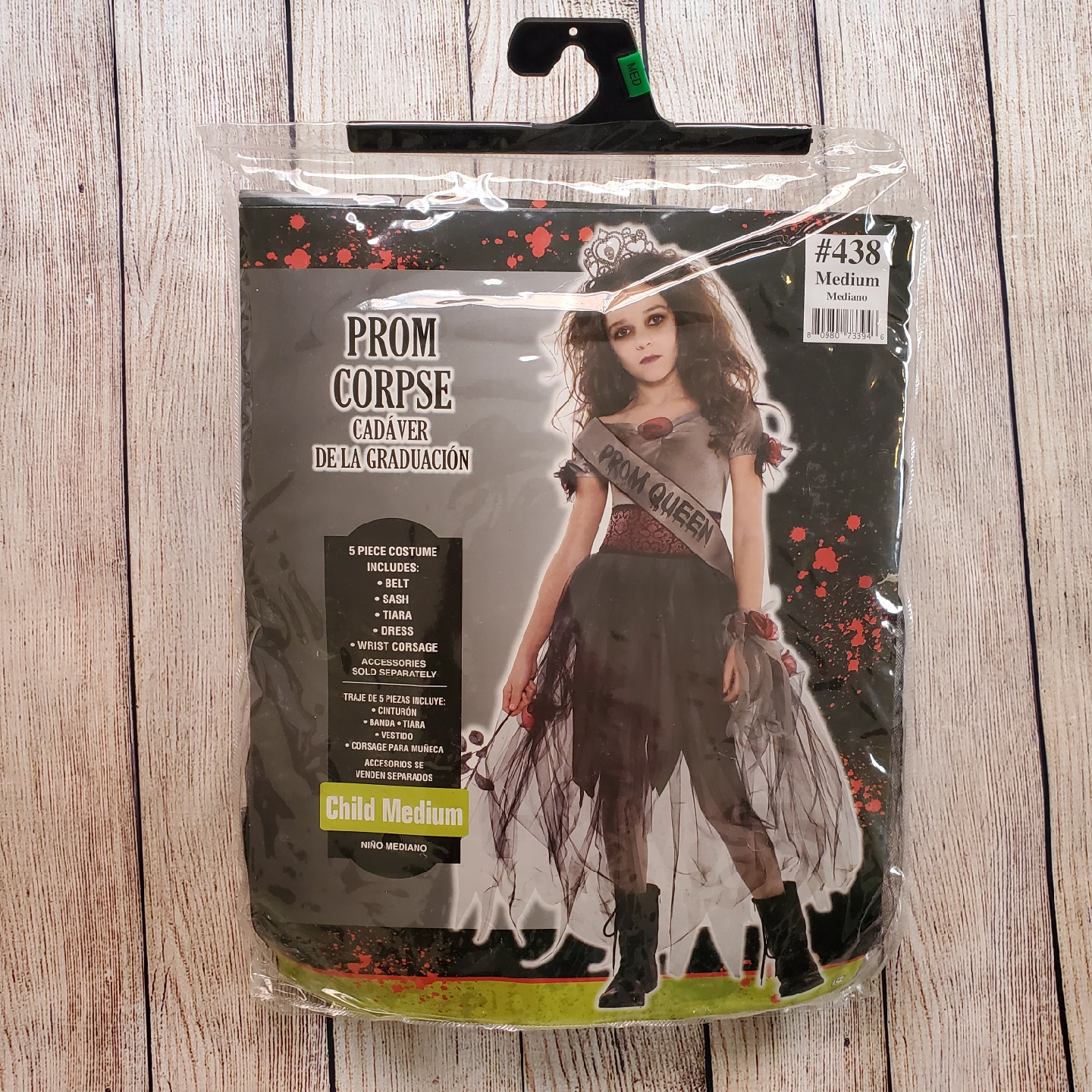 Get ready for a spooky prom night with this Prom Corpse costume! This 5-piece costume includes: - Belt - Sash - Tiara - Dress - Wrist Corsage It's a size Medium, perfect for a chillingly stylish Halloween or costume party