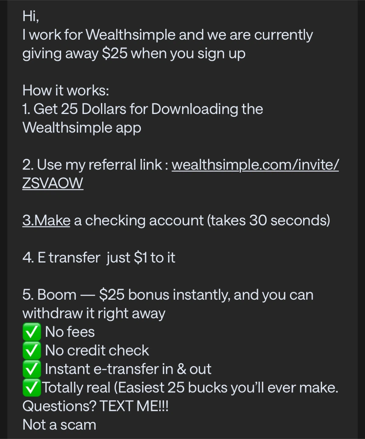 Hi, I work for Wealthsimple and we are currently giving away $25 when you sign up How it works: 1. Get 25 Dollars for Downloading the Wealthsimple app 2. Use my referral link : wealthsimple.com/invite/ZSVAOW 3.Make a checking account (takes 30 seconds) 4. E transfer just $1 to it 5. Boom — $25 bonus instantly, and you can withdraw it right away ✅ No fees ✅ No credit check ✅ Instant e-transfer in & out ✅Totally real (Easiest 25 bucks you’ll ever make. Questions? TEXT ME!!! Not a scam