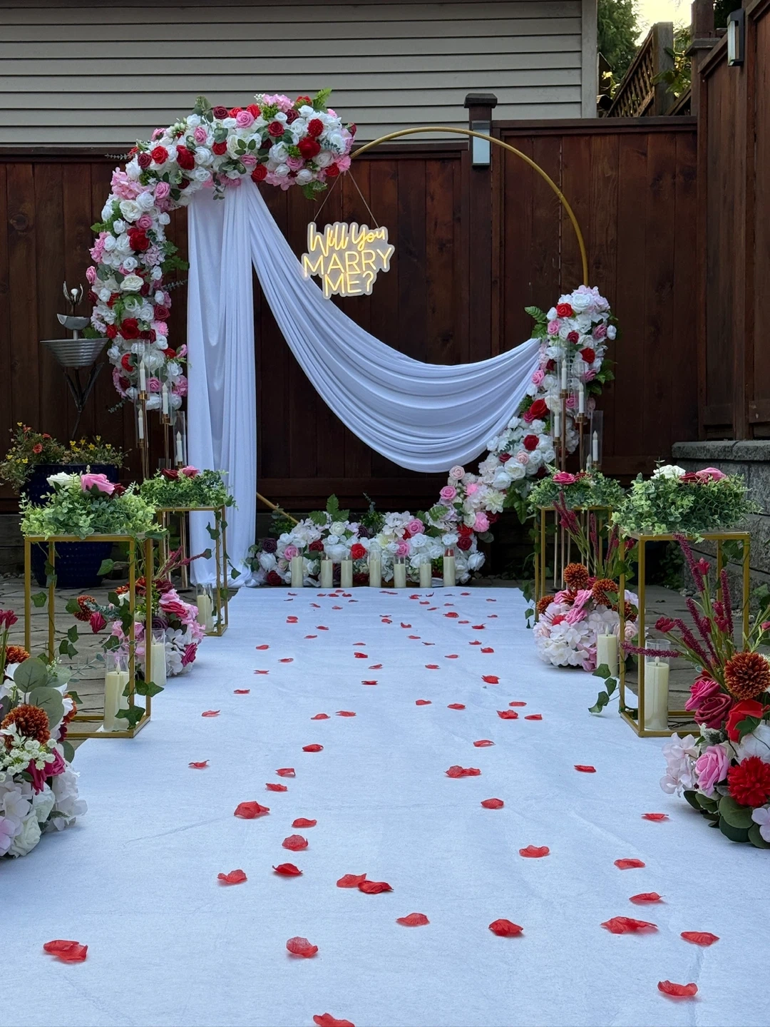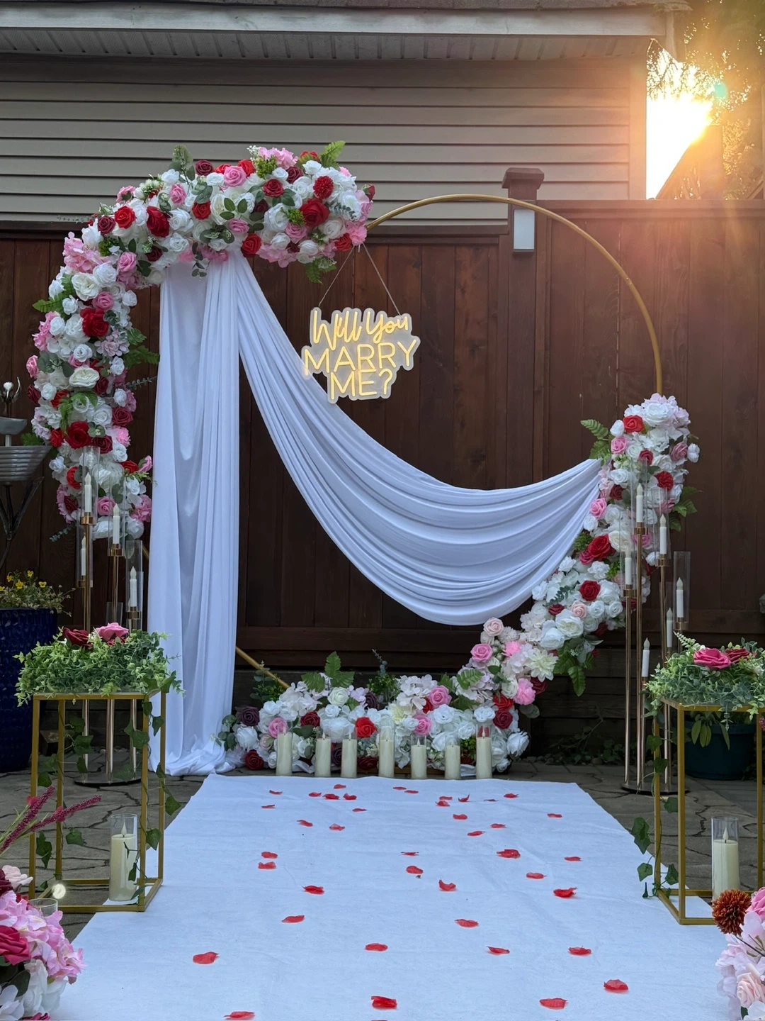 Beautiful wedding arch with floral decorations, perfect for creating a romantic and memorable setting for your special day. Includes a heart shaped arch, white fabric drape, floral arrangements in pink, white, and red, candle stands and aisle decor with setup and takedown. Let me know if you're interested!