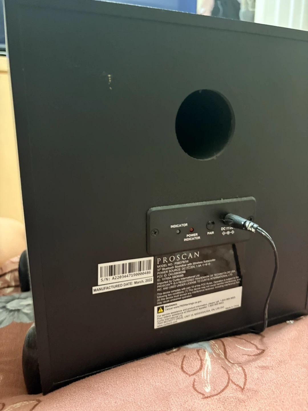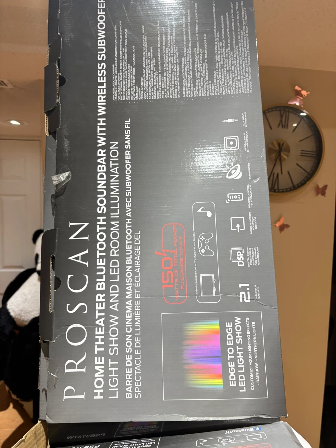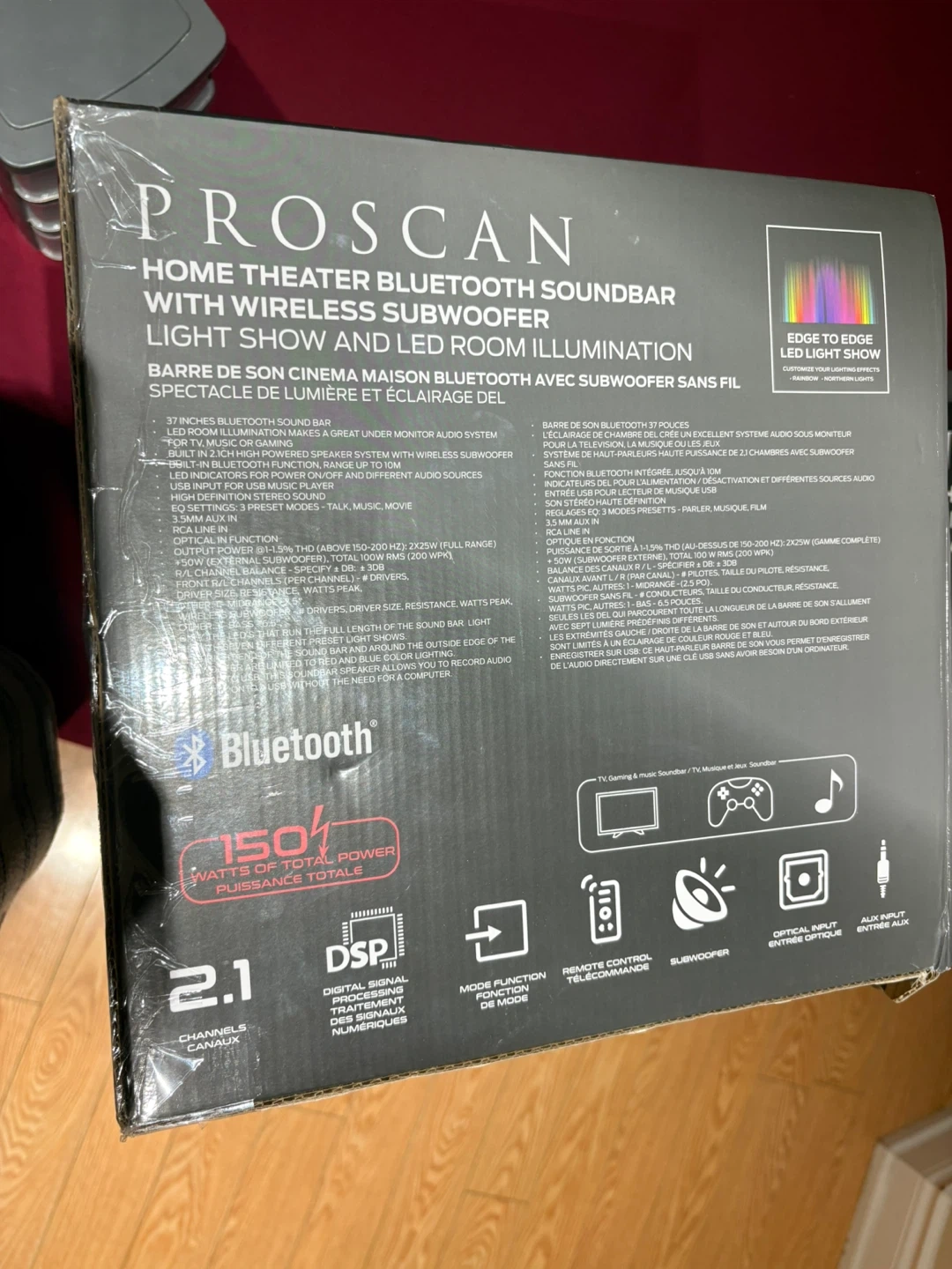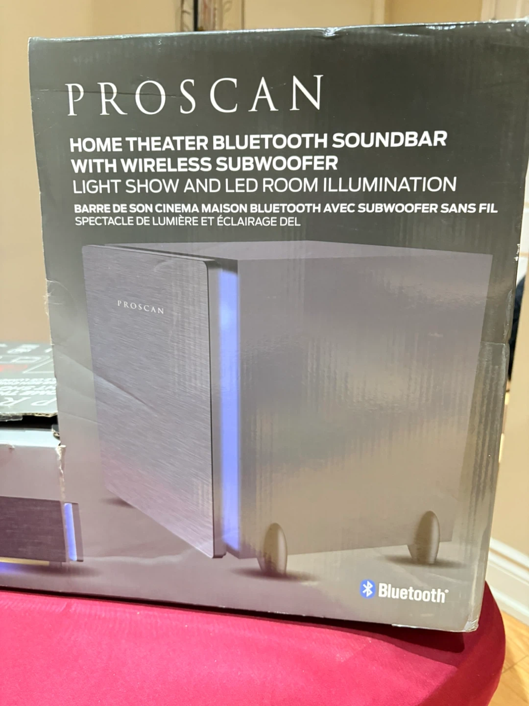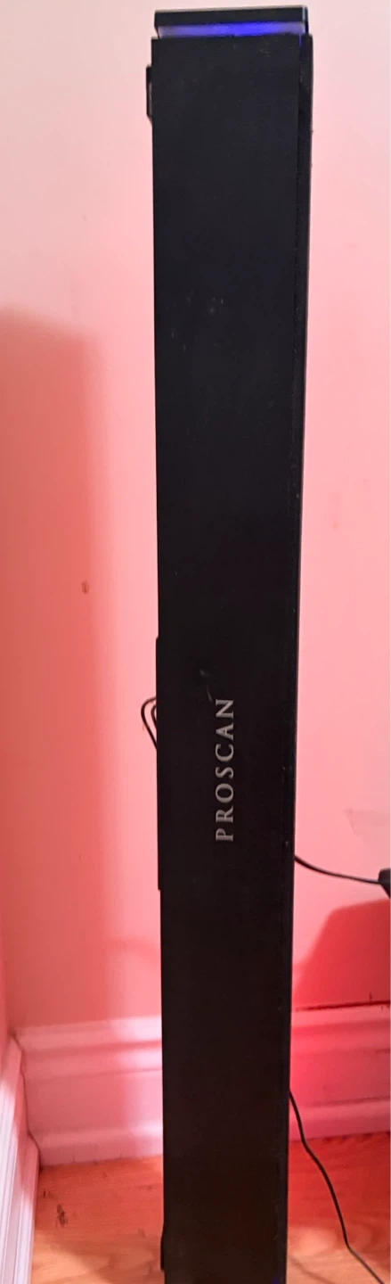 Selling a Proscan home theatre Bluetooth soundbar with a wireless subwoofer and light show/room illumination. It features edge-to-edge LED light show with rainbow/northern lights. The soundbar is 37 inches and has 150 watts of total power. Manufactured in March 2022.
