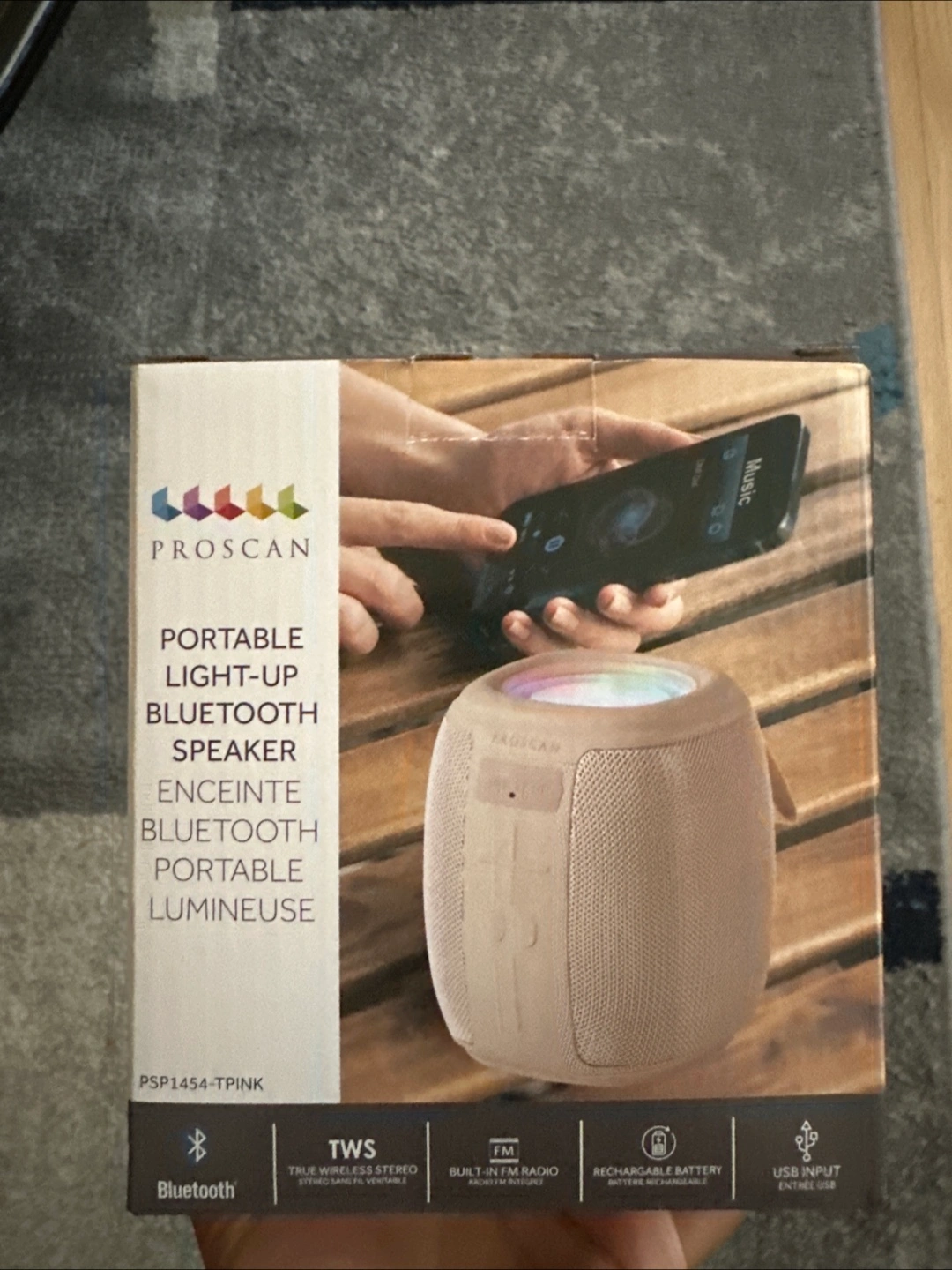 An attractive speaker in its original box. Portable light-up Bluetooth speaker. It provides true wireless stereo. You can use this speaker while enjoying a relaxing bath or doing some yoga.