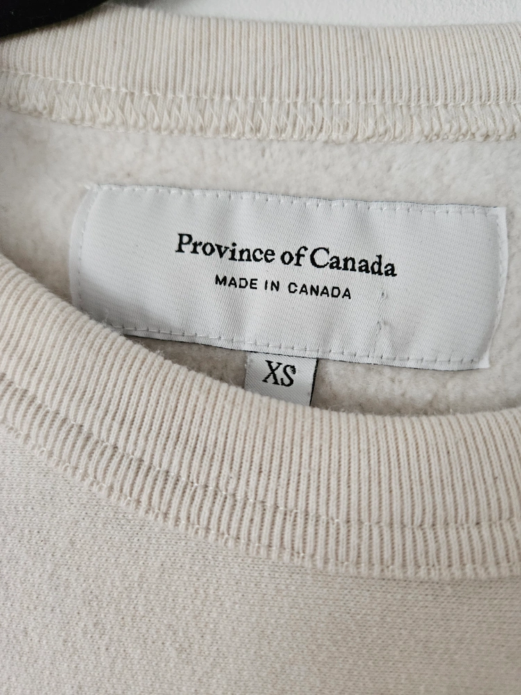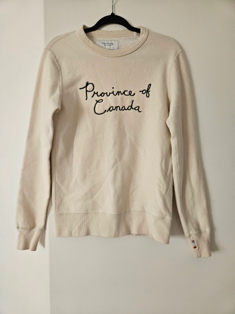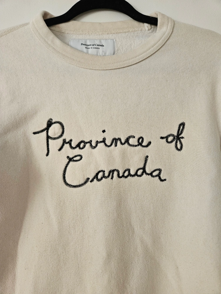 Cream-coloured crewneck sweatshirt. Features embroidered Province of Canada logo. Size XS. Made in Canada.
