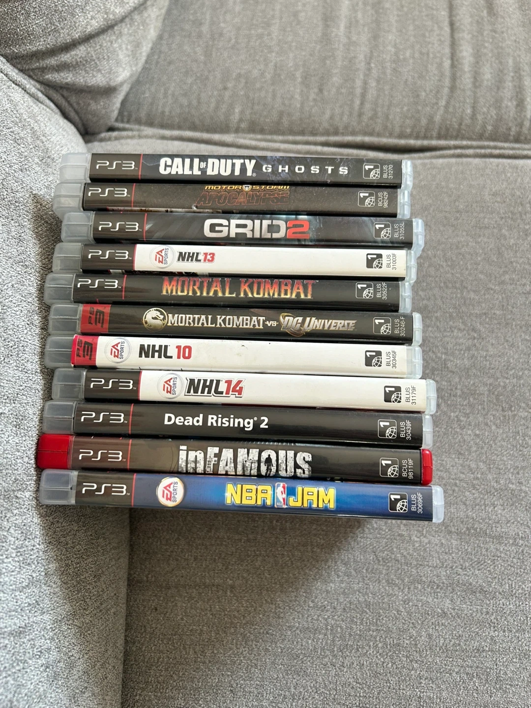 Selling a used PlayStation 3 console with a controller and a bundle of games. The games included are: - Call of Duty: Ghosts - Motorstorm Apocalypse - Grid 2 - NHL 13 - Mortal Kombat - Mortal Kombat vs DC Universe - NHL 10 - NHL 14 - Dead Rising 2 - Infamous - NBA Jam