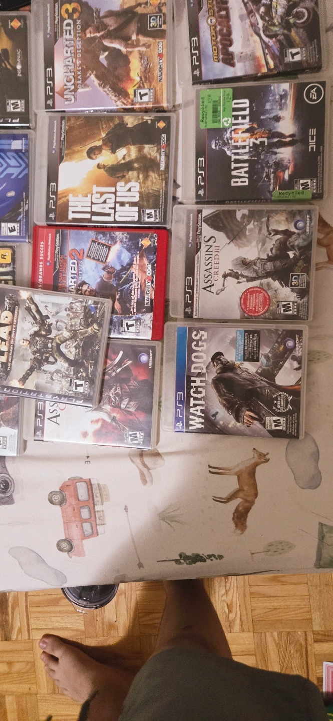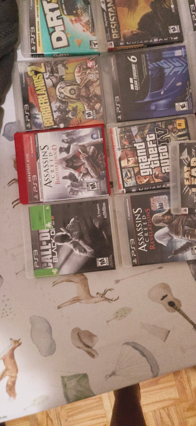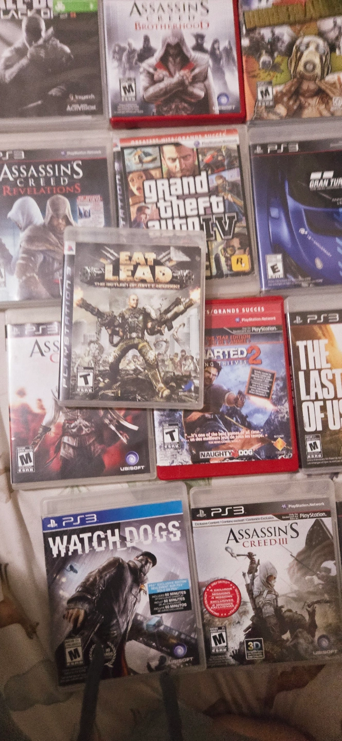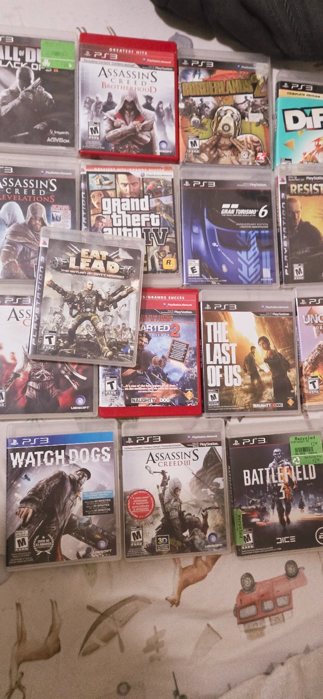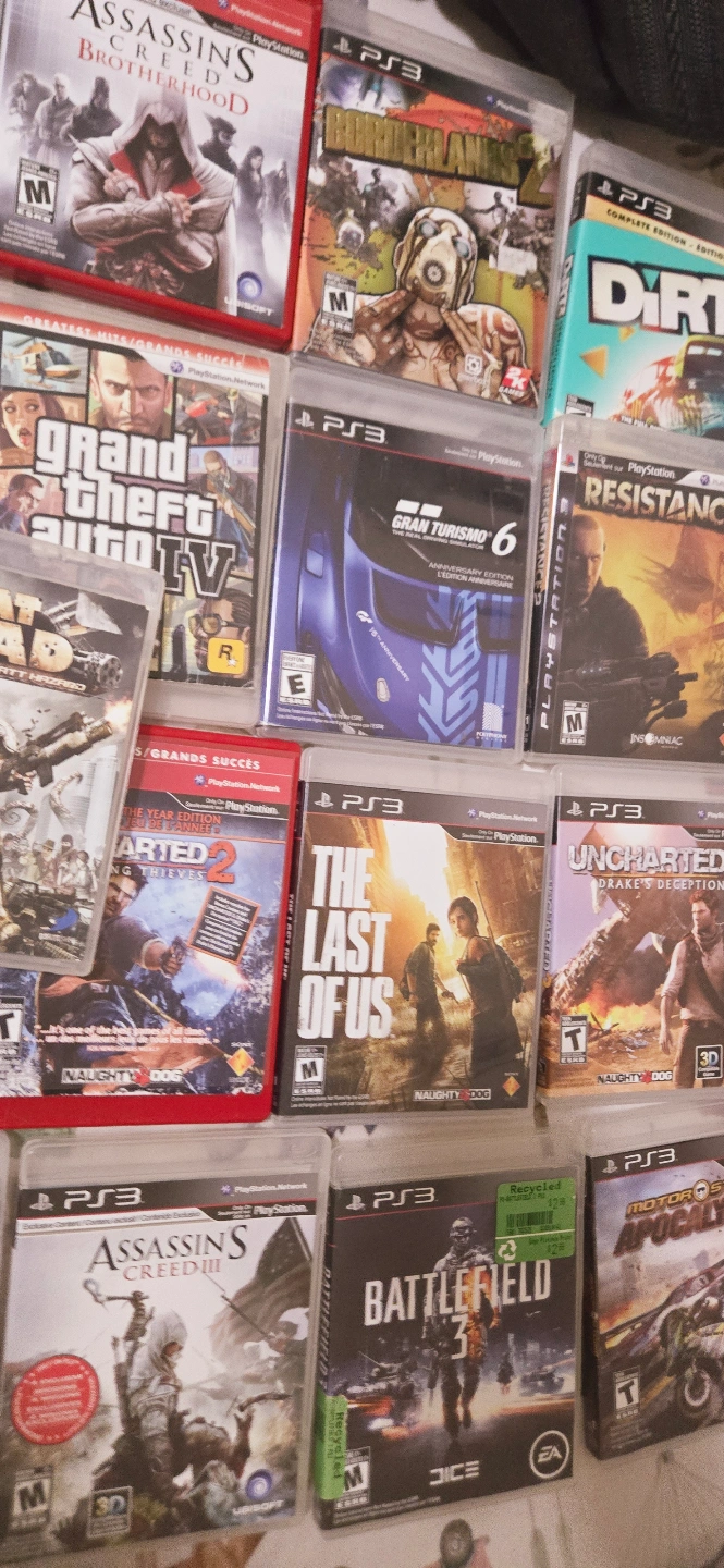 Collection of pre-owned PlayStation 3 games. Titles include: Dirt 3, Borderlands 2, Assassin's Creed Brotherhood, Grand Theft Auto IV, Gran Turismo 6, The Last of Us, Watch Dogs, and more. Variety of genres represented. Sold as a bundle.