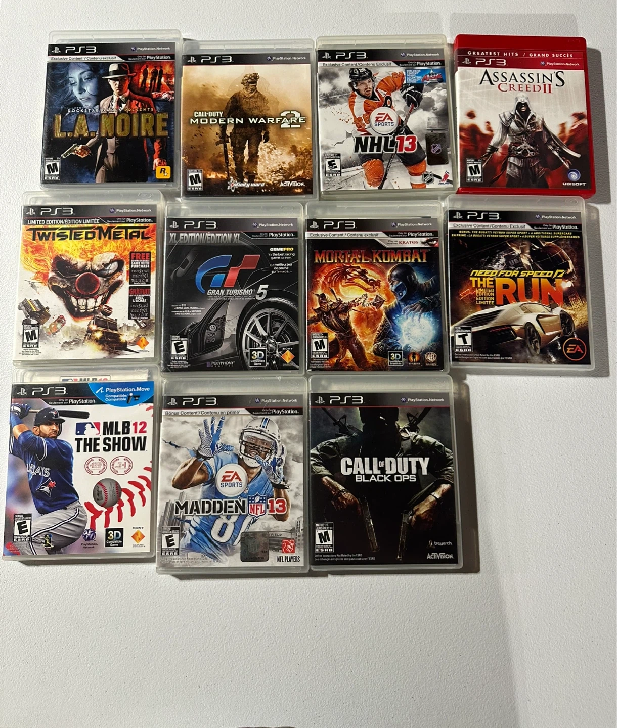 Selling PS3 games! Posting shows: - L.A. Noire - Call of Duty: Modern Warfare 2 - NHL 13 - Assassin's Creed II - Twisted Metal - Gran Turismo 5 XL Edition - Mortal Kombat - Need for Speed: The Run Limited Edition - MLB 12 The Show - Madden NFL 13 - Call of Duty: Black Ops $10 each.