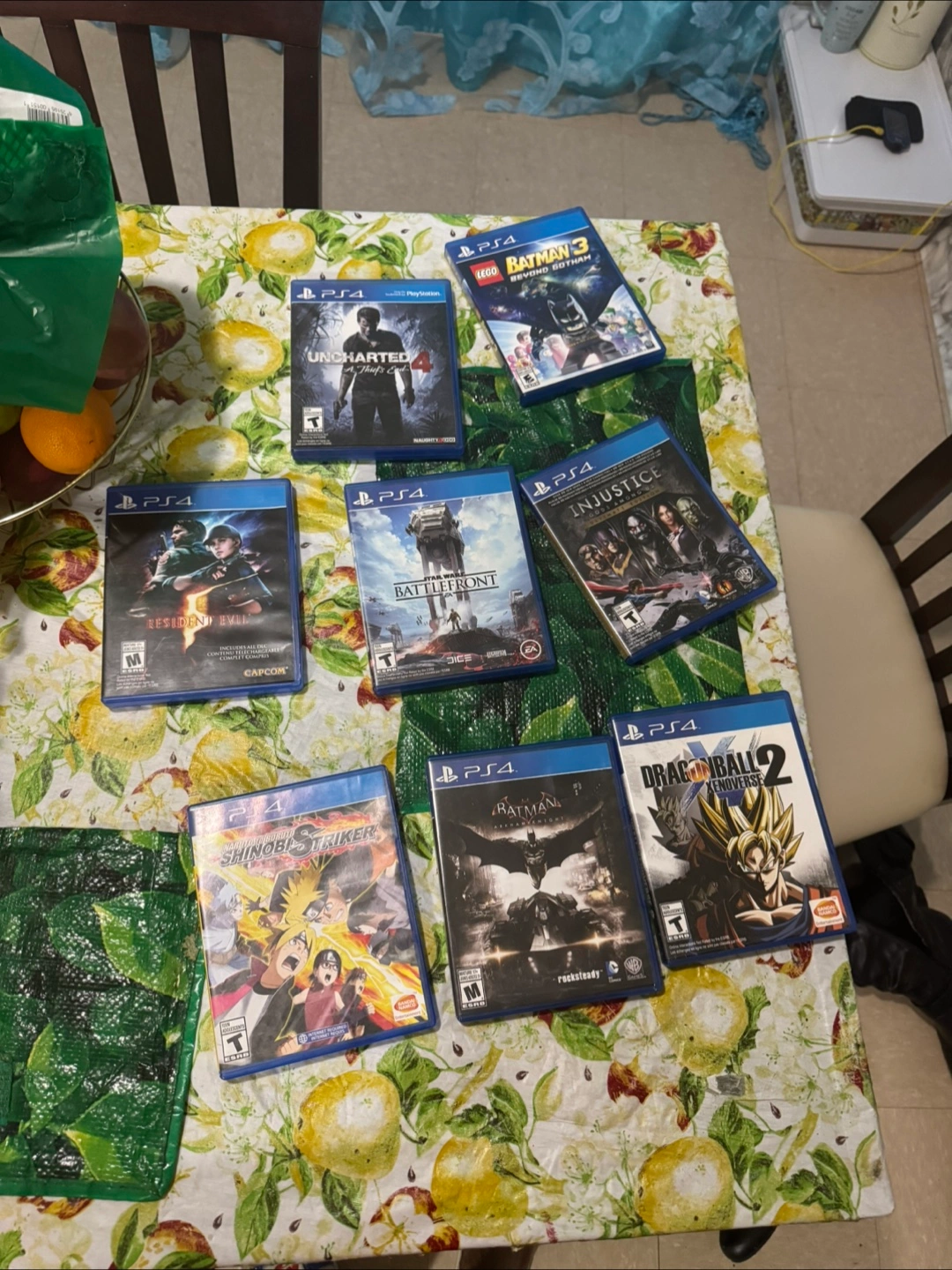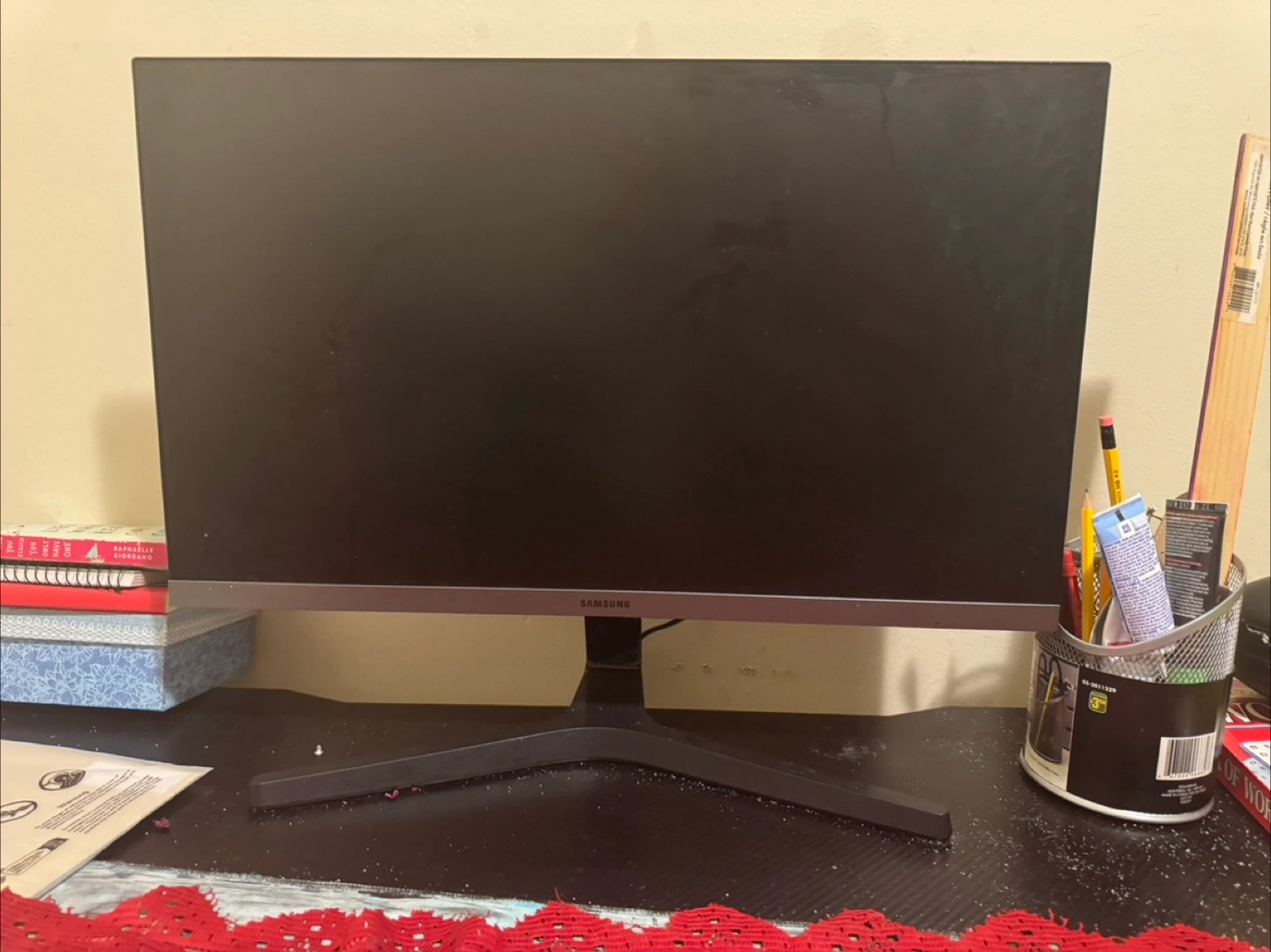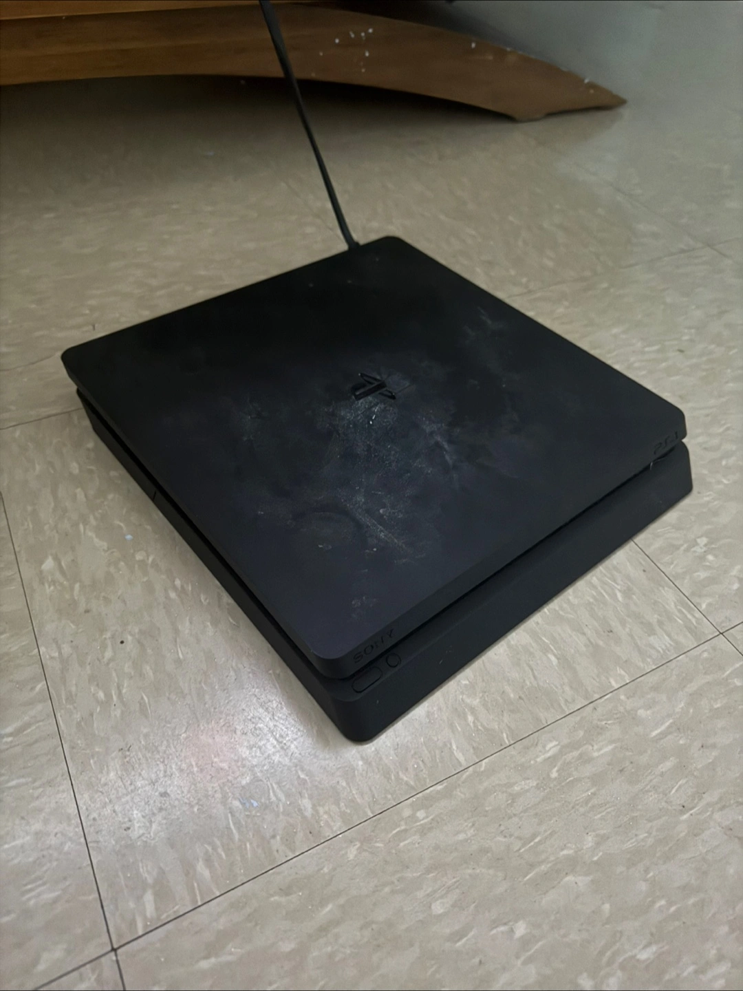 A black PS4 console. It appears to be in good condition. Various games also up for sale. Some games include the Demon Slayer game, Uncharted 4, and more. Spend some time relaxing with this fun gaming set. You get a Samsung monitor as well.