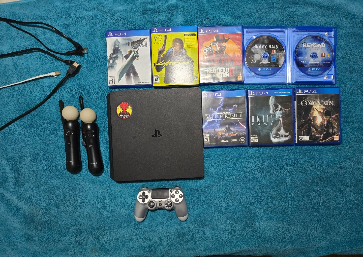 Selling a rarely used PlayStation 4 console with a variety of games. Includes titles like Red Dead Redemption 2, Heavy Rain & Beyond Two Souls, Battlefront 2, Until Dawn, Code Vein, and Cyberpunk 2077. Limited collectables included with Cyberpunk and Code Vein (ie. Map, Bag) Silver PS4 controller and PSMove motion controllers (works with VR, dont have VR)