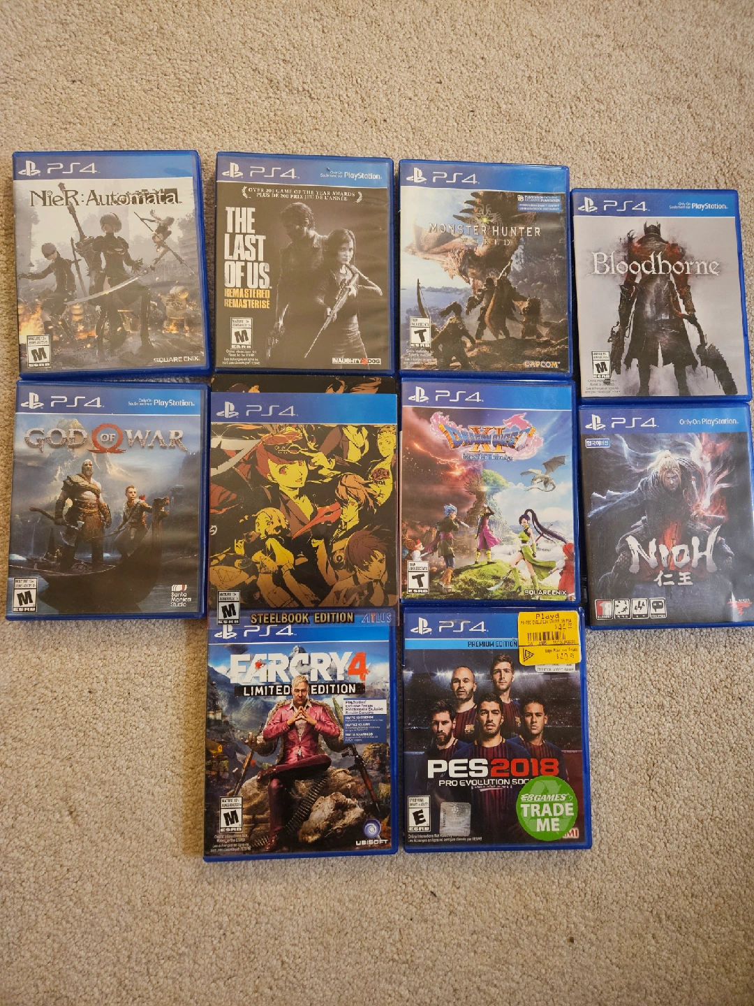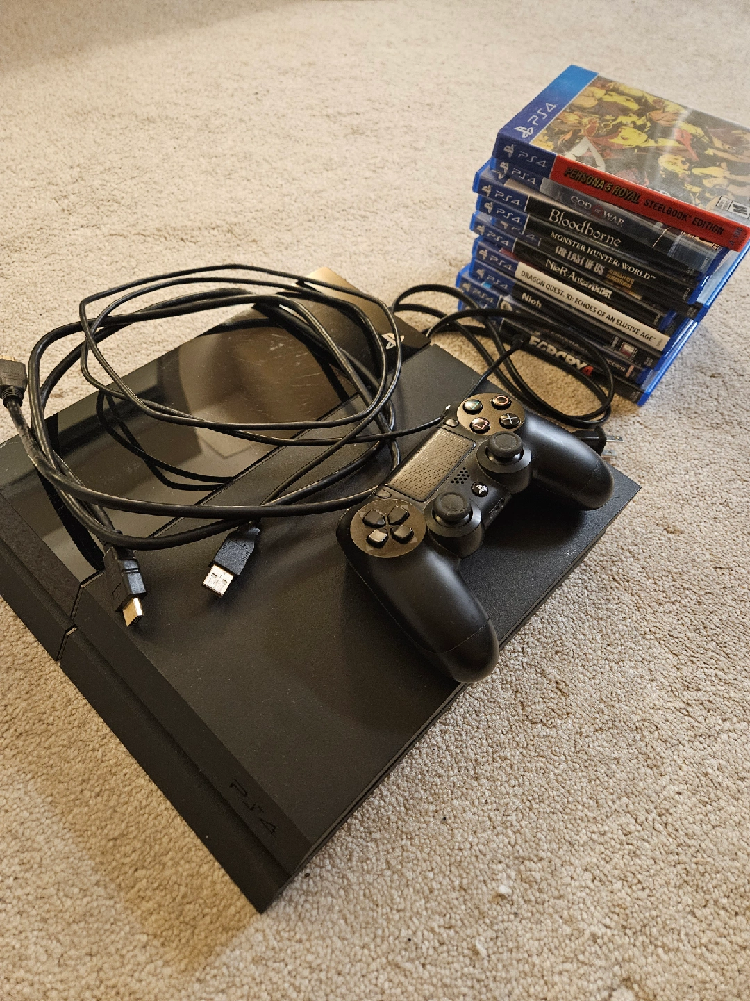 Selling ps4 with a controller, 10 games and cables. Cable includes HDMI cable, power cord and controller charging cable. Games included: 1. Persona 5 Royal Steelbook Edition 2. Dragon Quest 11 3. God of War 4. The Last of Us Remastered 5. Monster Hunter World 6. Bloodborne 7. Nier Automata 8. Nioh 9. Farcry 4 10. PES 2018