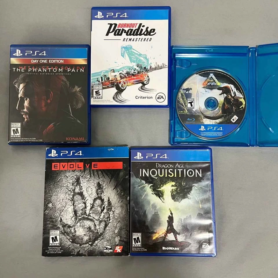 Games: • Burnout Paradise Remastered 15$ • Metal Gear Solid V Phantom Pain 15$ • Dragon Age Inquisition 10$ • Evolve 10$ • Ark Survival Evolved (No-Case) 5$ All working great, can test them on my Ps4 and send you a vid, send msg. Xbox one/360 titles available too, Check my FB marketplace profile!