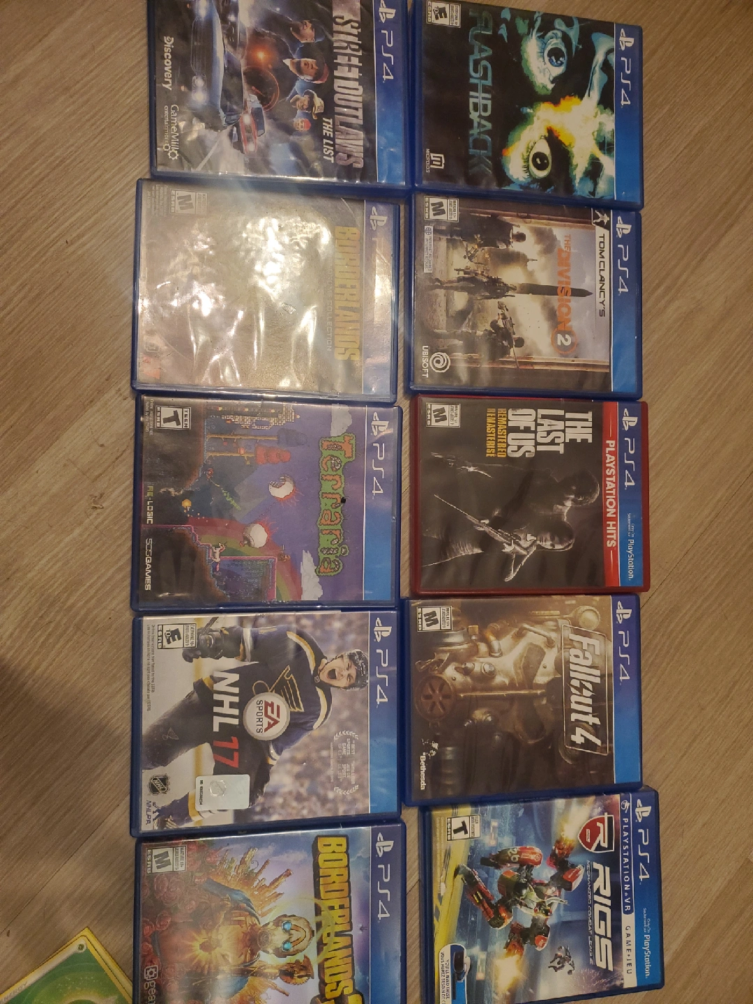 Selling a collection of PS4 games! Titles include: - Flashback - Tom Clancy's The Division 2 - The Last of Us Remastered - Fallout 4 - RIGS Mechanized Combat League (PlayStation VR) - Street Outlaws: The List - Borderlands - Terraria - NHL 17