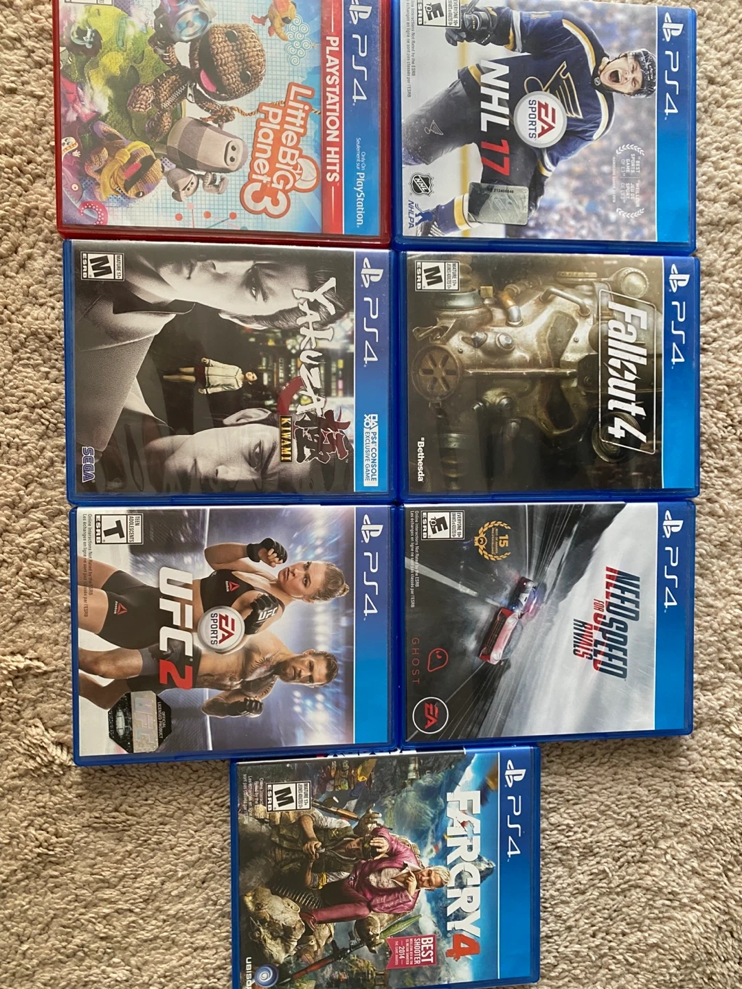 Selling a collection of PS4 games. Includes: - Little Big Planet 3 - NHL 17 - Fallout 4 - Need for Speed Rivals - UFC 2 - Far Cry 4 - Yakuza Kiwami