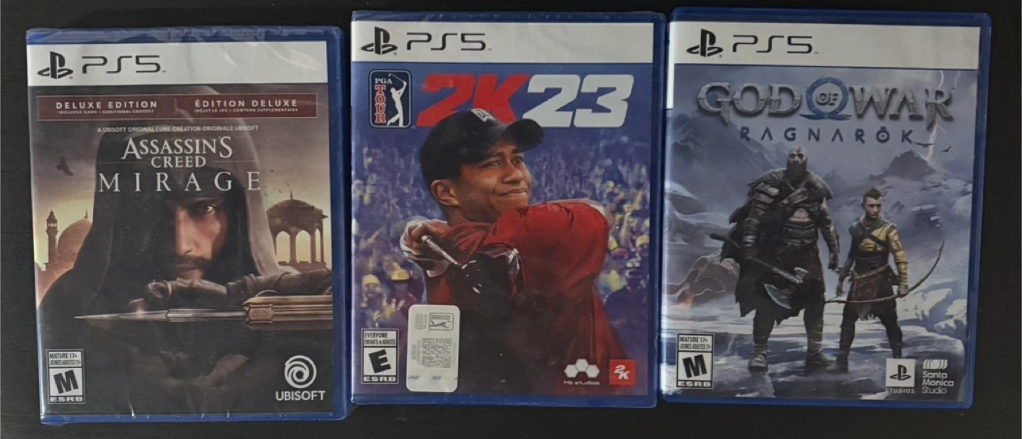 Selling a PS5 copy of Assassin's Creed Mirage Deluxe Edition! It's in great condition. 2K23 golf brand new and Gods of War Ragnarok used twice asking $50 each or all for $130 for all OBO