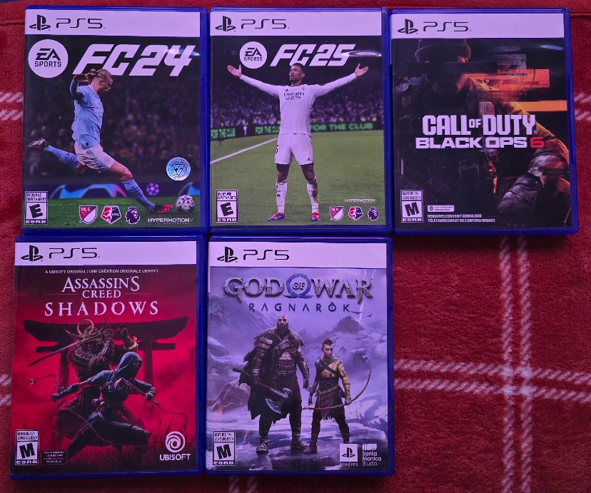 Selling a collection of PS5 games. Includes: - EA Sports FC 24 - EA Sports FC 25 - Call of Duty Black Ops 6 - Assassin's Creed Shadows - God of War Ragnarok
