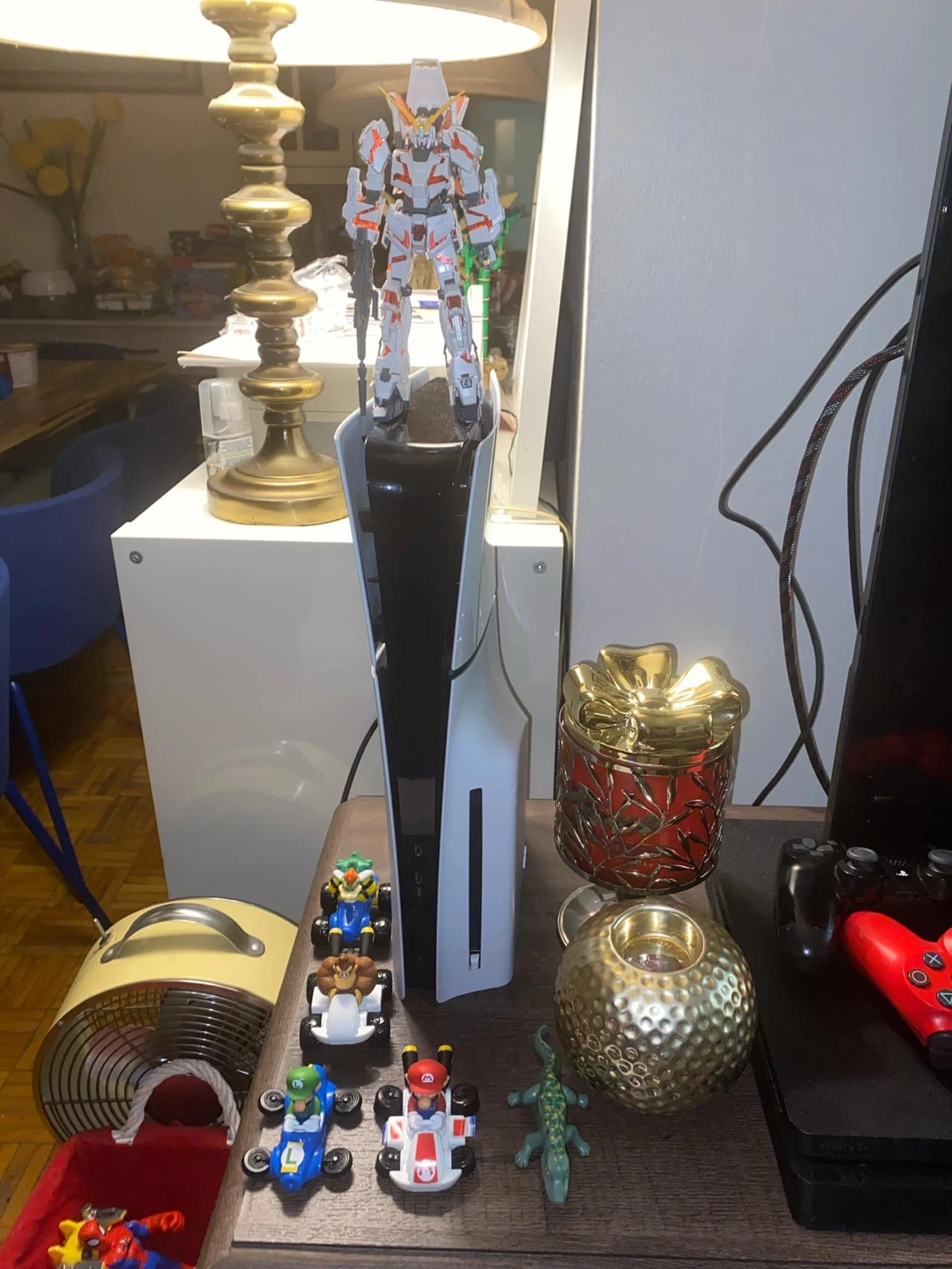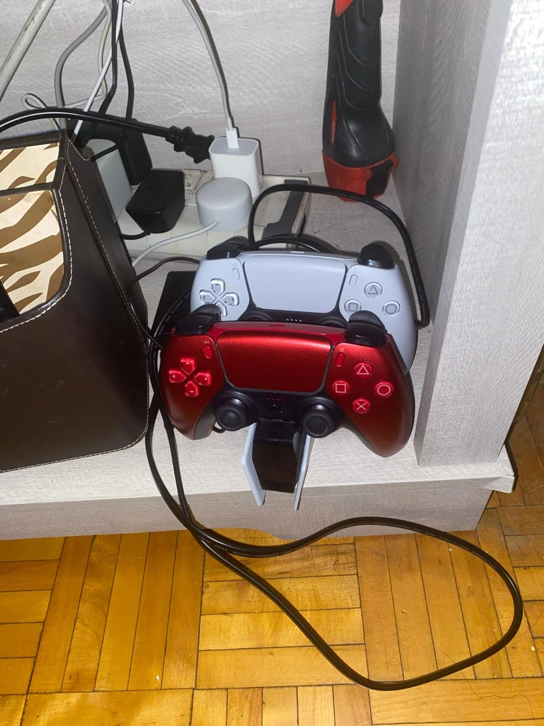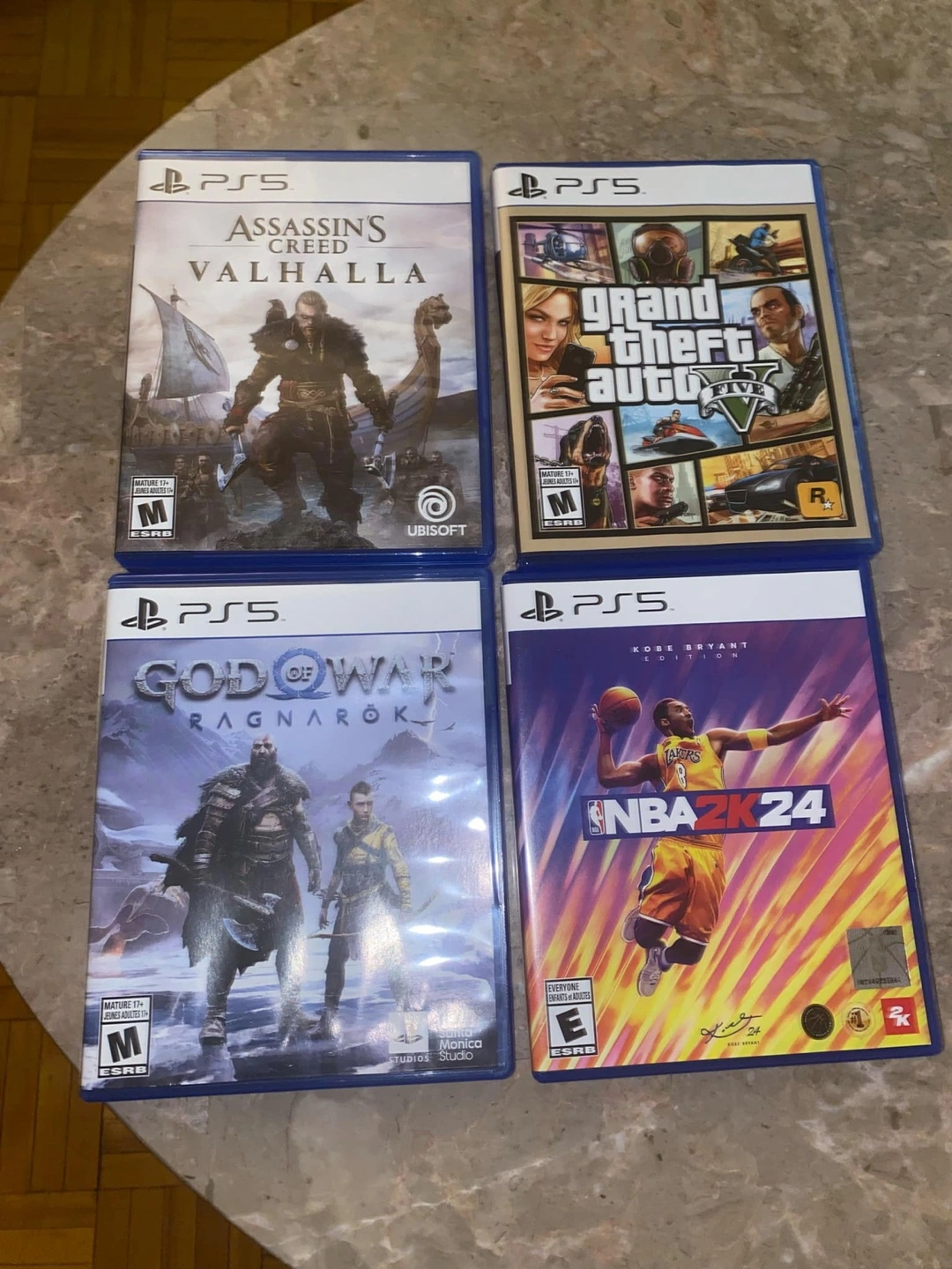 Four PS5 games: Assassin's Creed Valhalla, Grand Theft Auto V, God of War Ragnarök, and NBA 2K24. Includes a PS5 console, two DualSense controllers (one white, one red), a charging station, and a USB-C cable. Plus, some small figurines. With a warranty