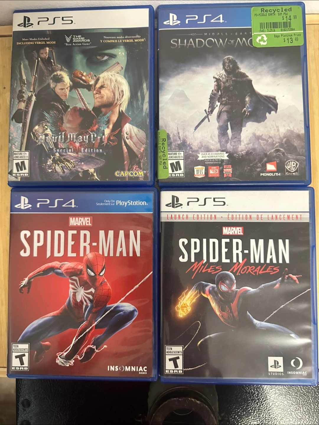 PS5 Devil May Cry $20 PS5 Spiderman miles morales $30 PS4 spider man $20 PS4 shadow of Mordor $10