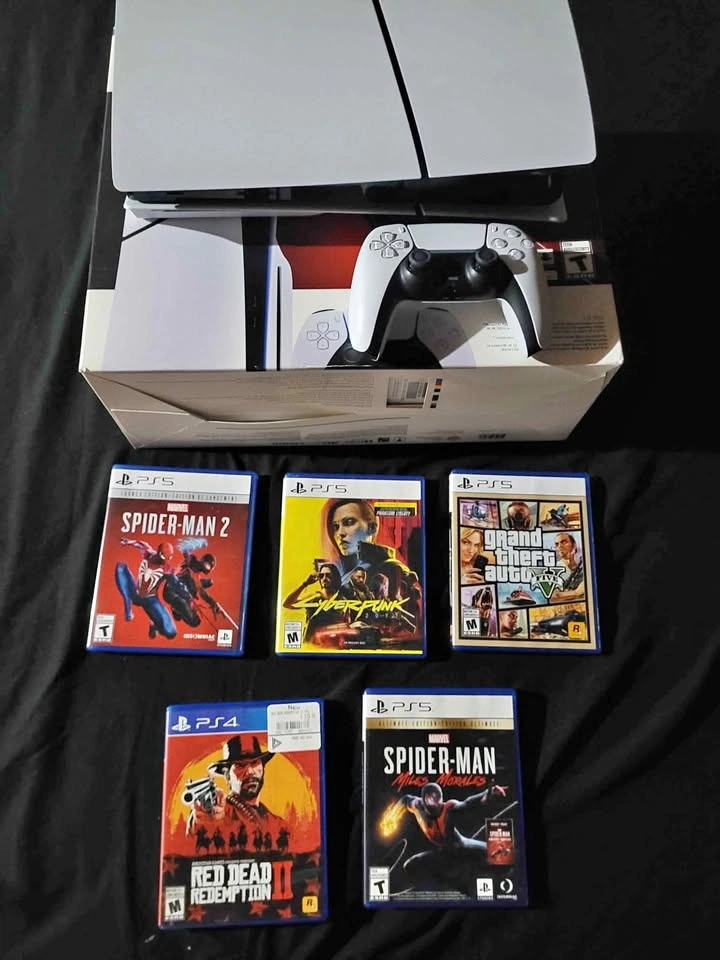 Everything included: • PS5 Slim w original cables and box • Spiderman: Miles Morales (Spiderman Remastered code already redeemed) • Spiderman 2 Launch Edition (Includes Launch Edition Code) • Cyberpunk 2077 (DLC not included) • GTA V • Red Dead Redemption 2 Also, I will consider trading for a Switch 2 console in great condition