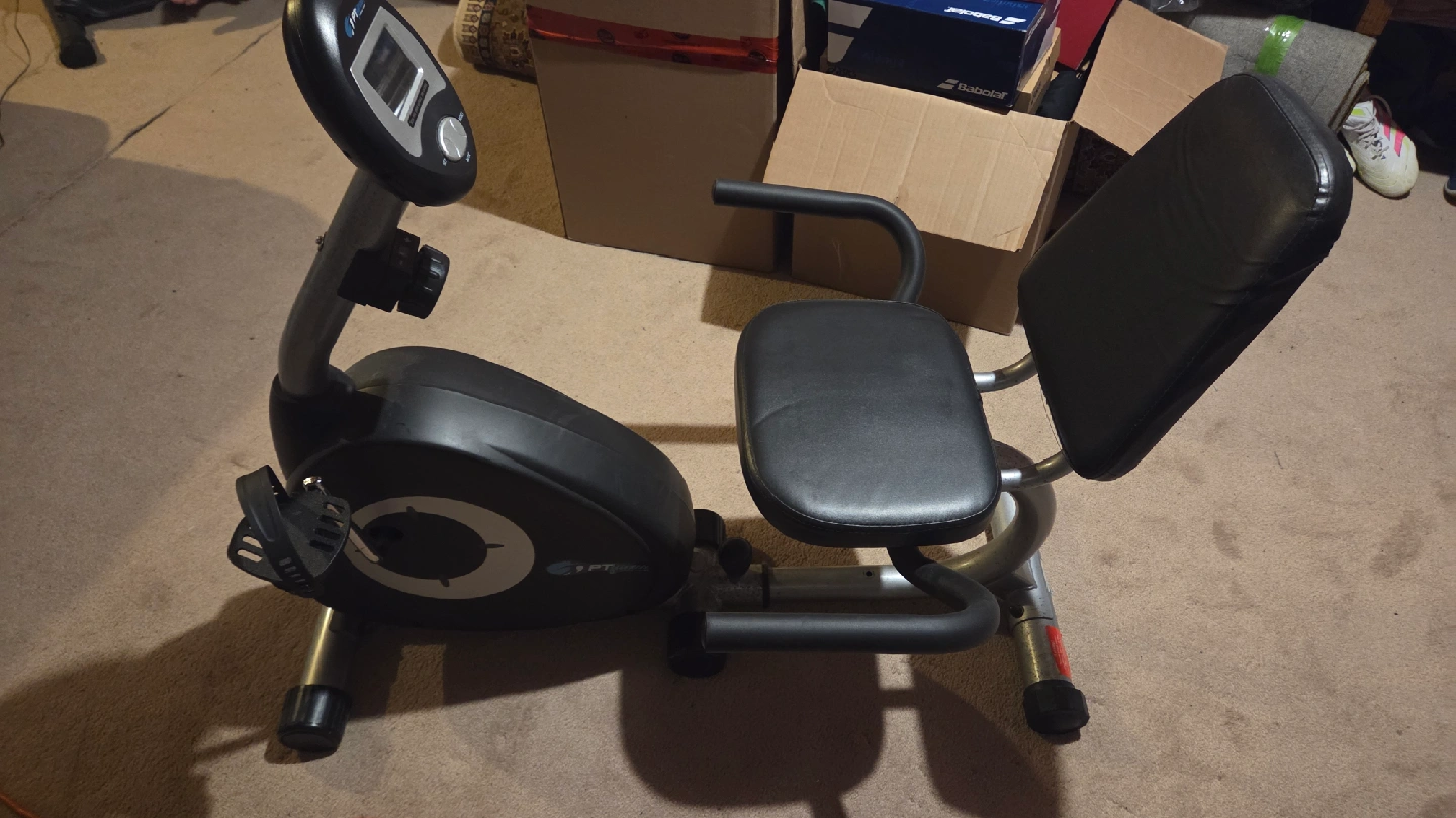 Get a great workout from the comfort of your home with this recumbent exercise bike from PT Fitness! It's in good condition and ready for a new owner. The display shows scan time, speed, distance, and calories burned, so you can track your progress easily. Perfect for anyone looking to stay active indoors!