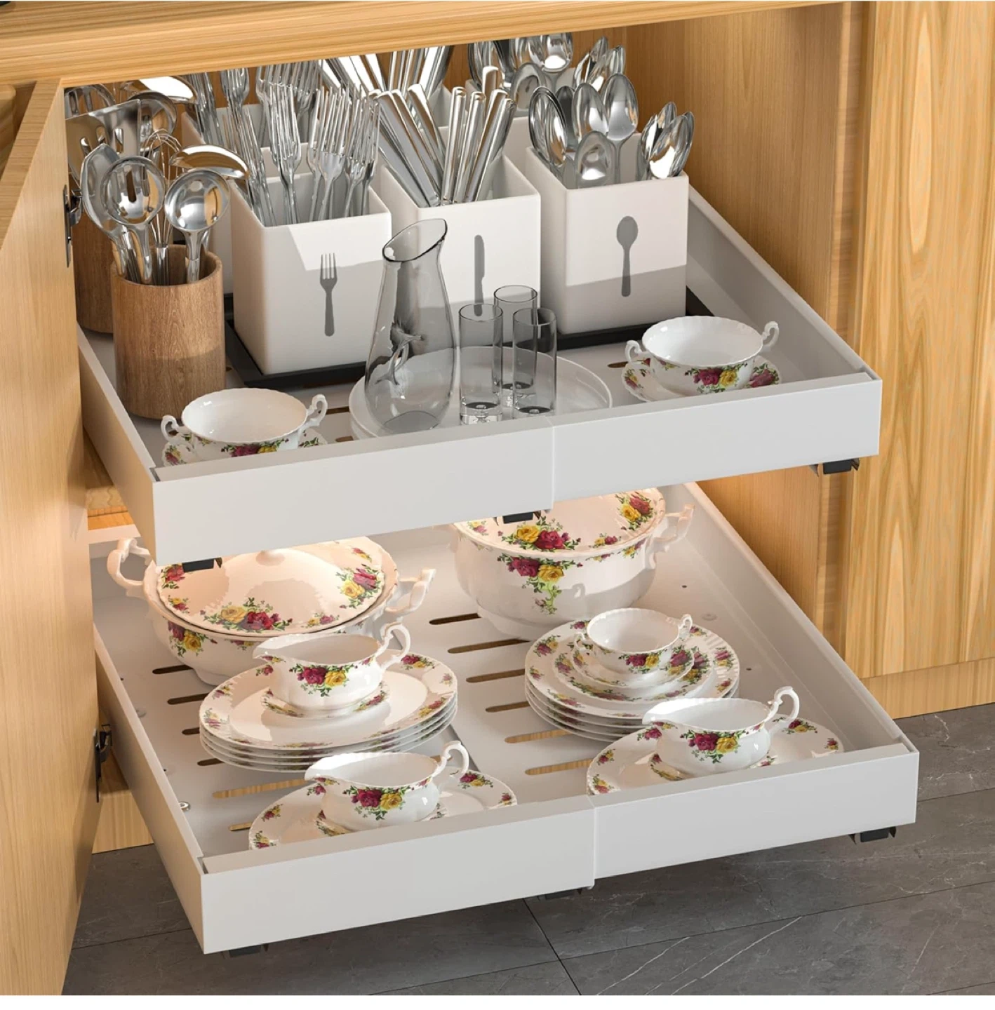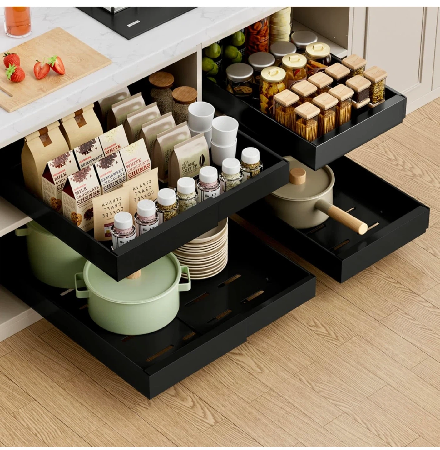 Declutter your kitchen with this handy pull-out cabinet organizer! It's perfect for maximizing space and keeping everything neat and tidy. Easy to install and adjust to fit your needs. Smooth edges and sturdy slides ensure steadiness and durability