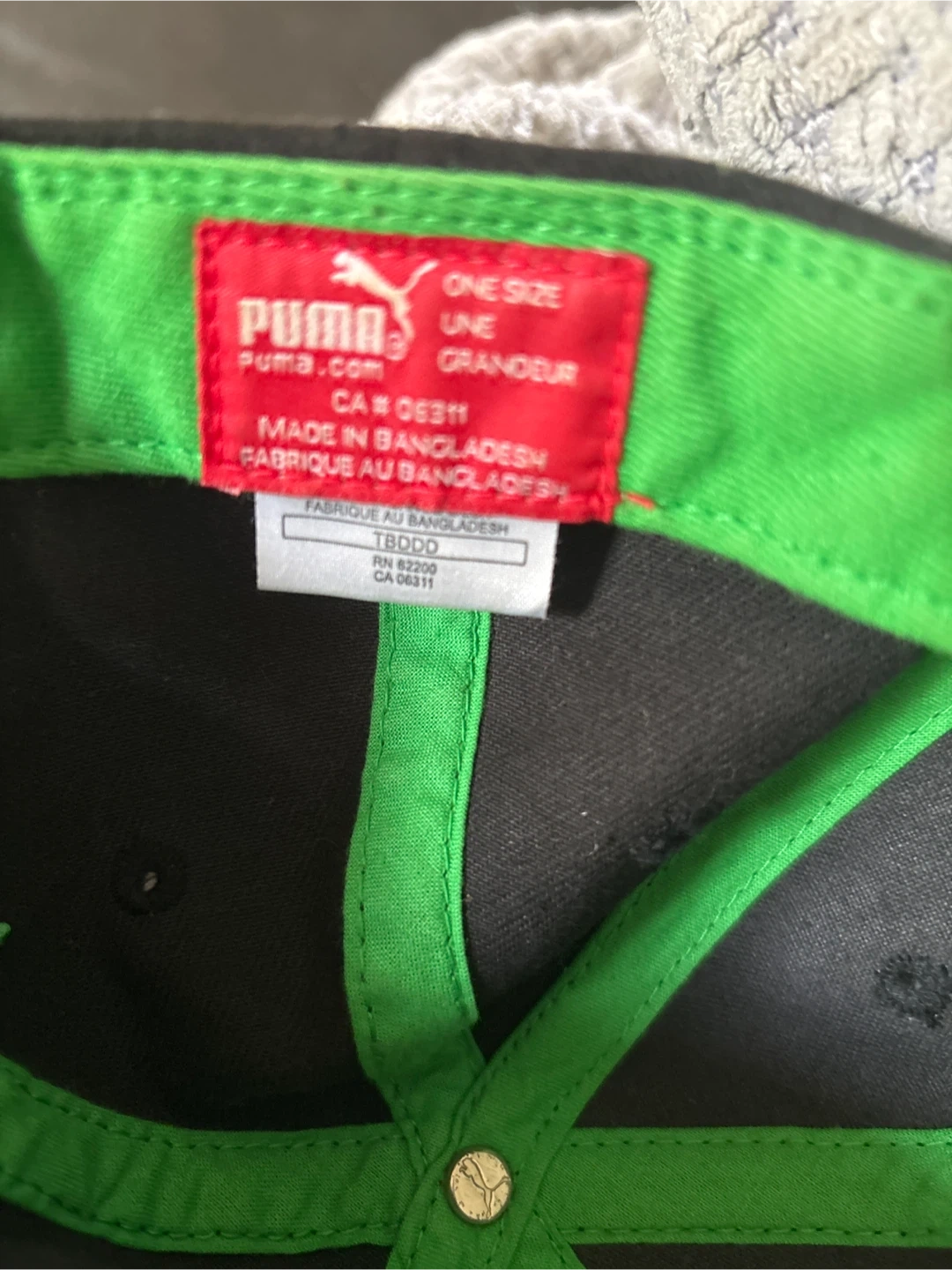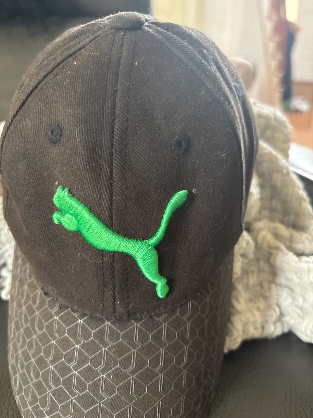 Selling a Puma baseball cap in black with green accents. It's a one-size-fits-all cap, perfect for everyday wear. The Puma logo is embroidered in green on the front.