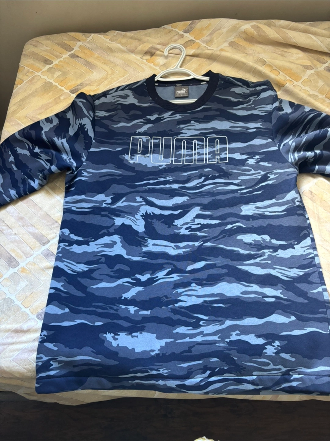 Here's a cool Puma crewneck sweatshirt with a blue camo pattern! It's in great shape and ready for a new home. Perfect for casual wear or workouts!