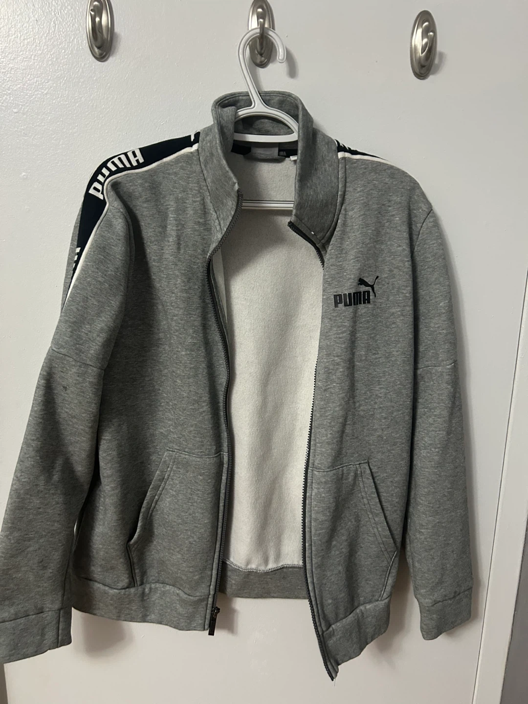 Selling a grey Puma track jacket in size small. It features the Puma logo on the sleeve and chest. Great for workouts or casual wear!
