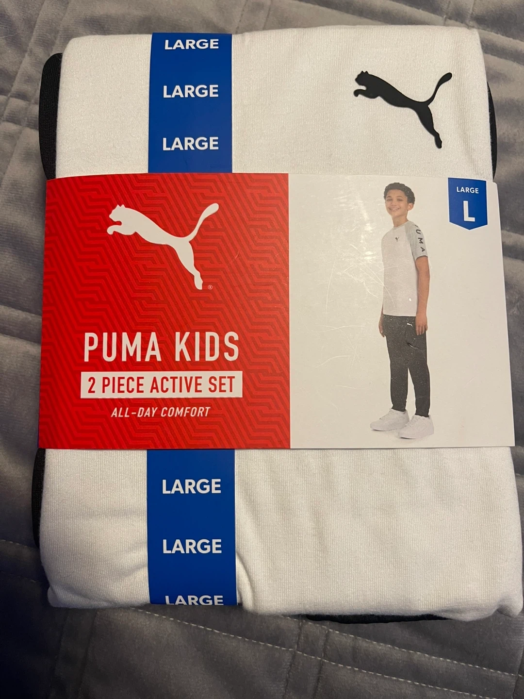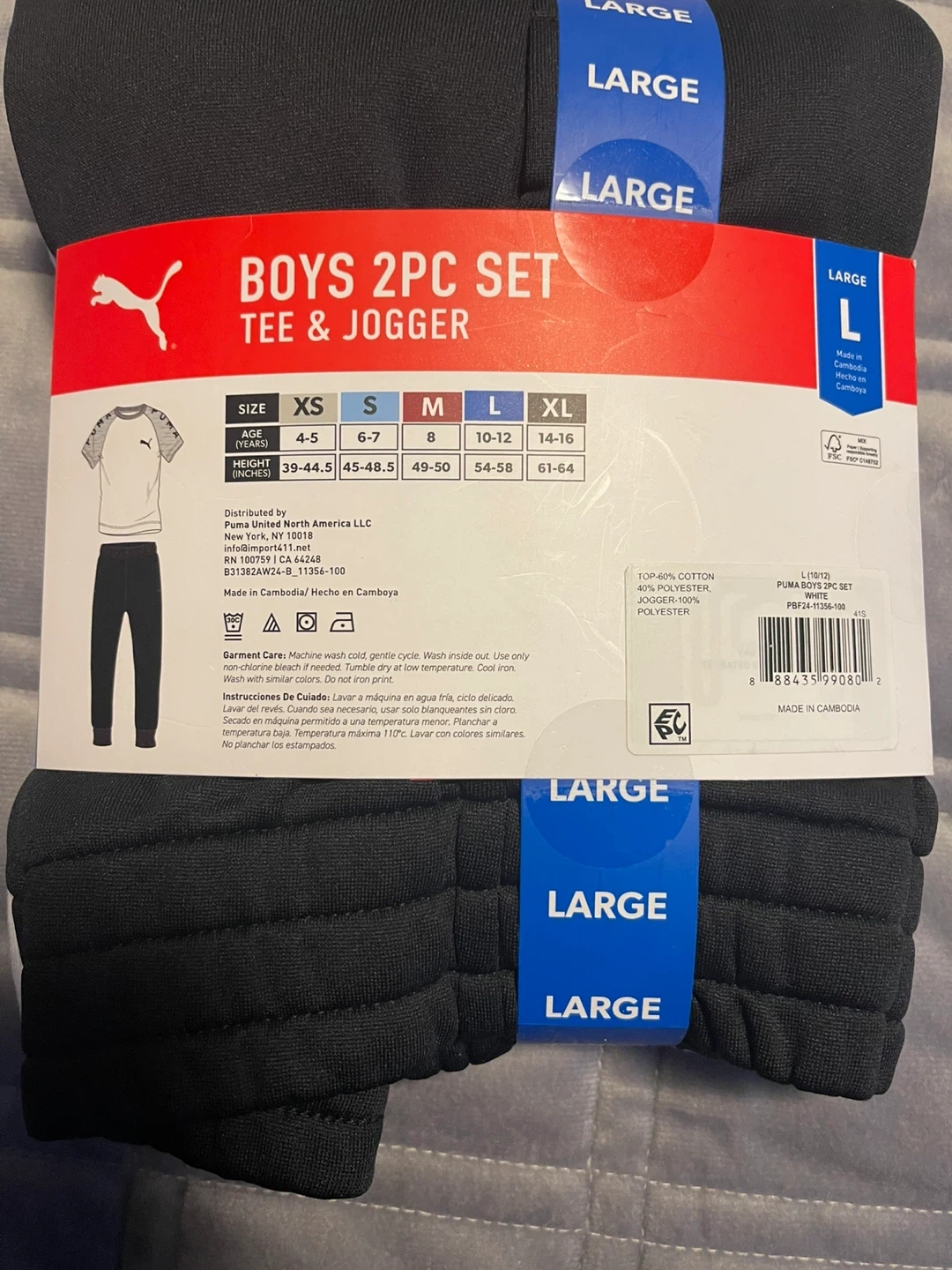 This is a Puma Kids 2-piece active set, perfect for all-day comfort! It includes a tee and jogger. The size is large, suitable for ages 10-12 or height 54-58 inches. The set is made of 60% cotton and 40% polyester.