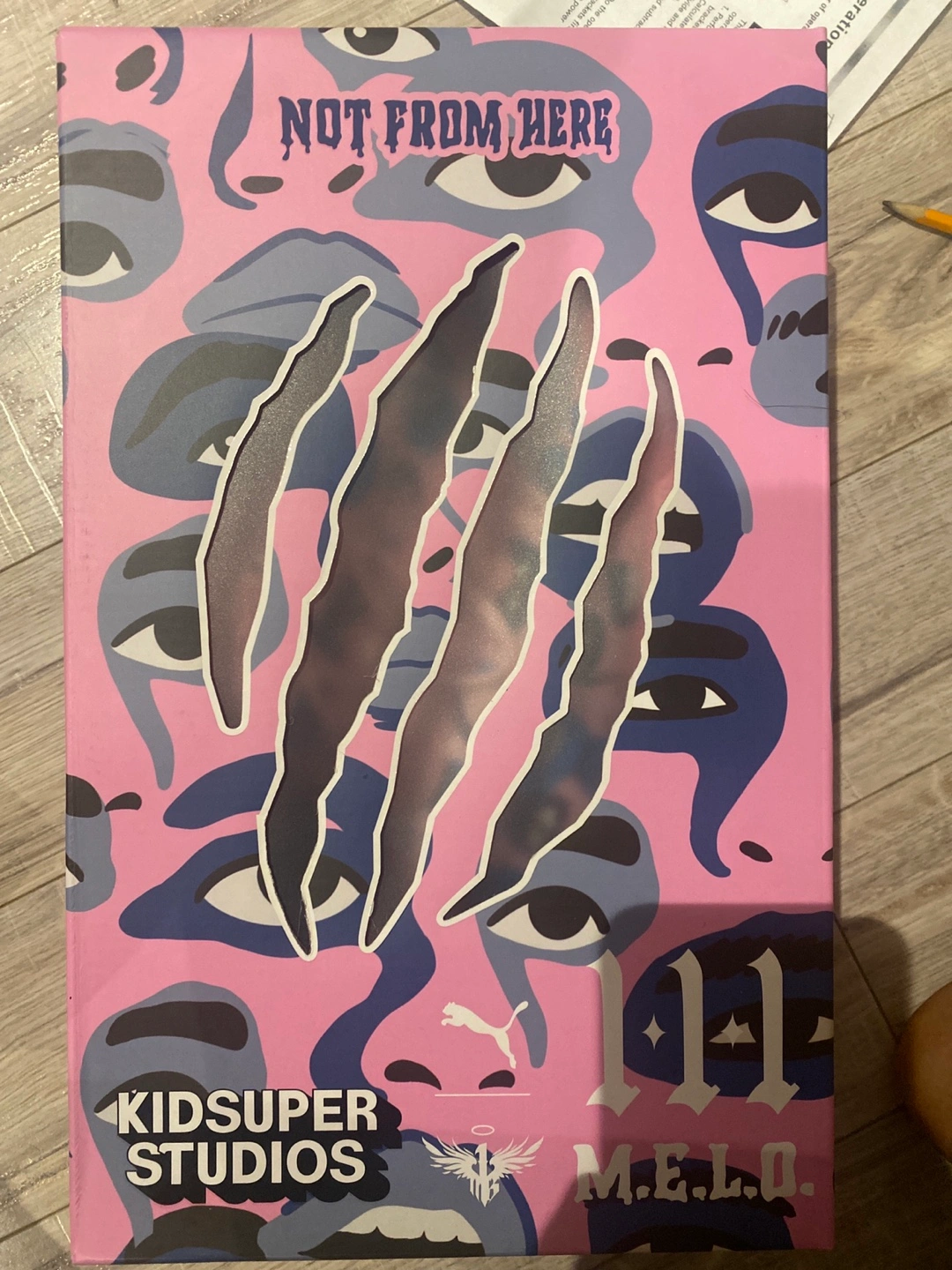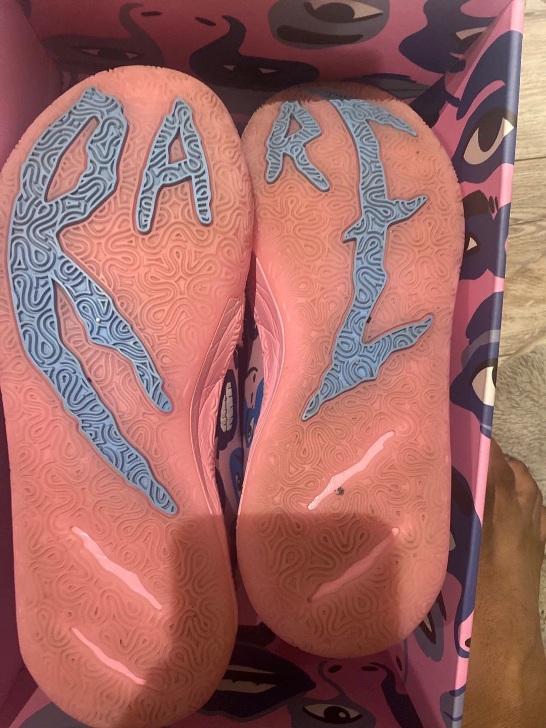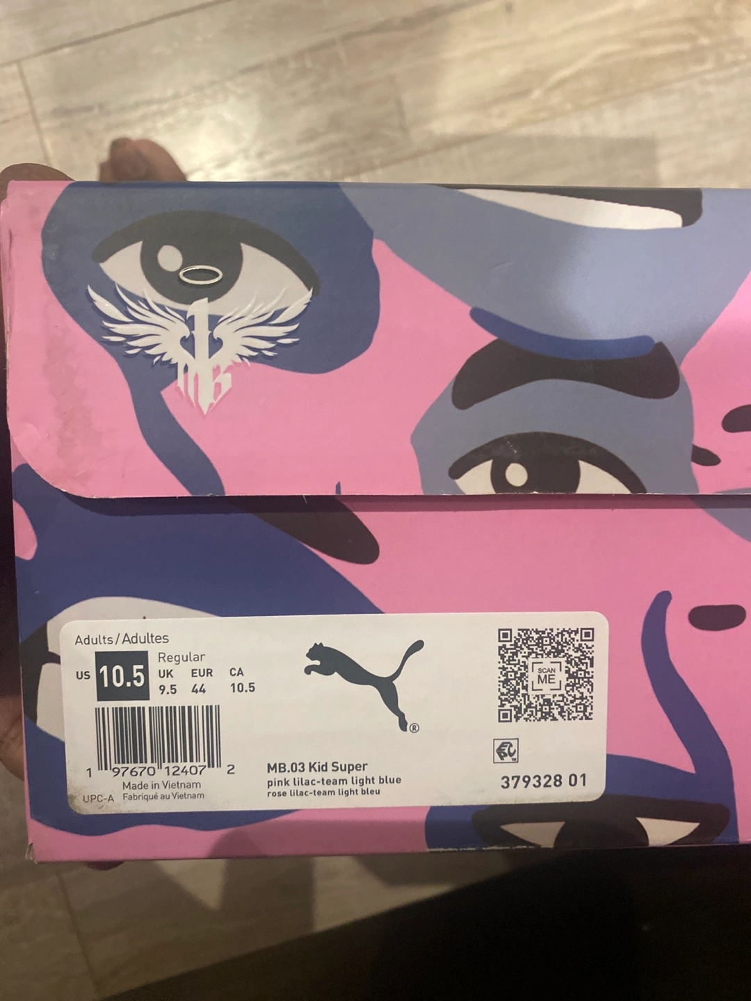 Selling a pair of Puma MB.03 KidSuper basketball shoes in US size 10.5. These shoes feature a unique pink lilac-team light blue colourway and a distinctive design. The original box is included, making it perfect for collectors or anyone looking for a stylish pair of basketball shoes Wear only once!!!!