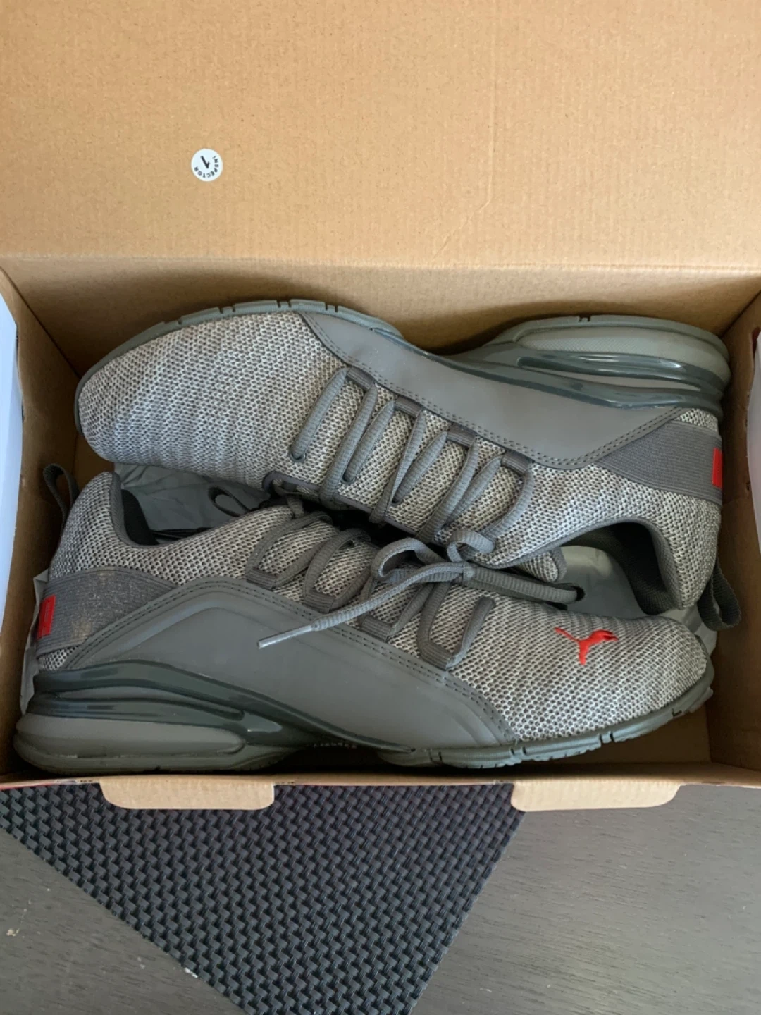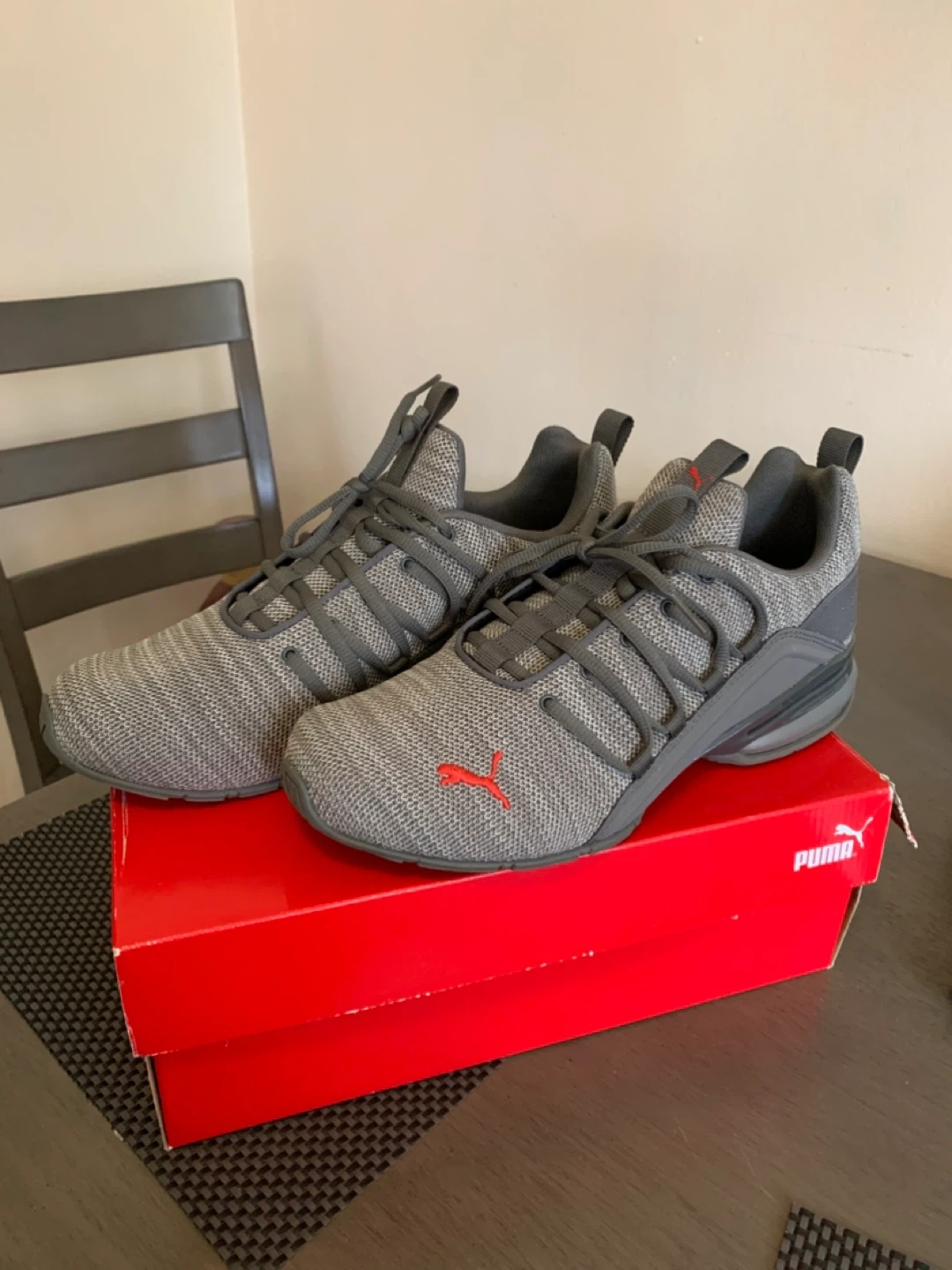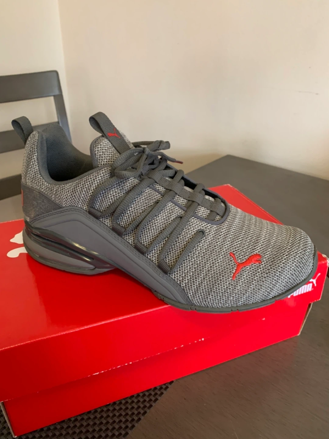 Selling a pair of Puma Axelion Refresh sneakers in size 8.5 US. They feature a stylish gray and red colourway. The shoes are in great condition and come with the original box!