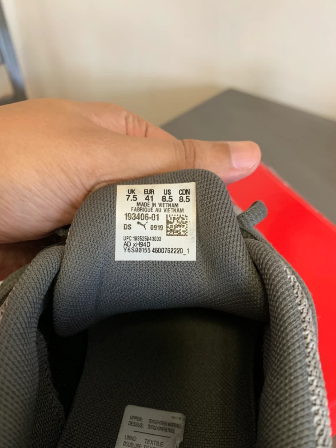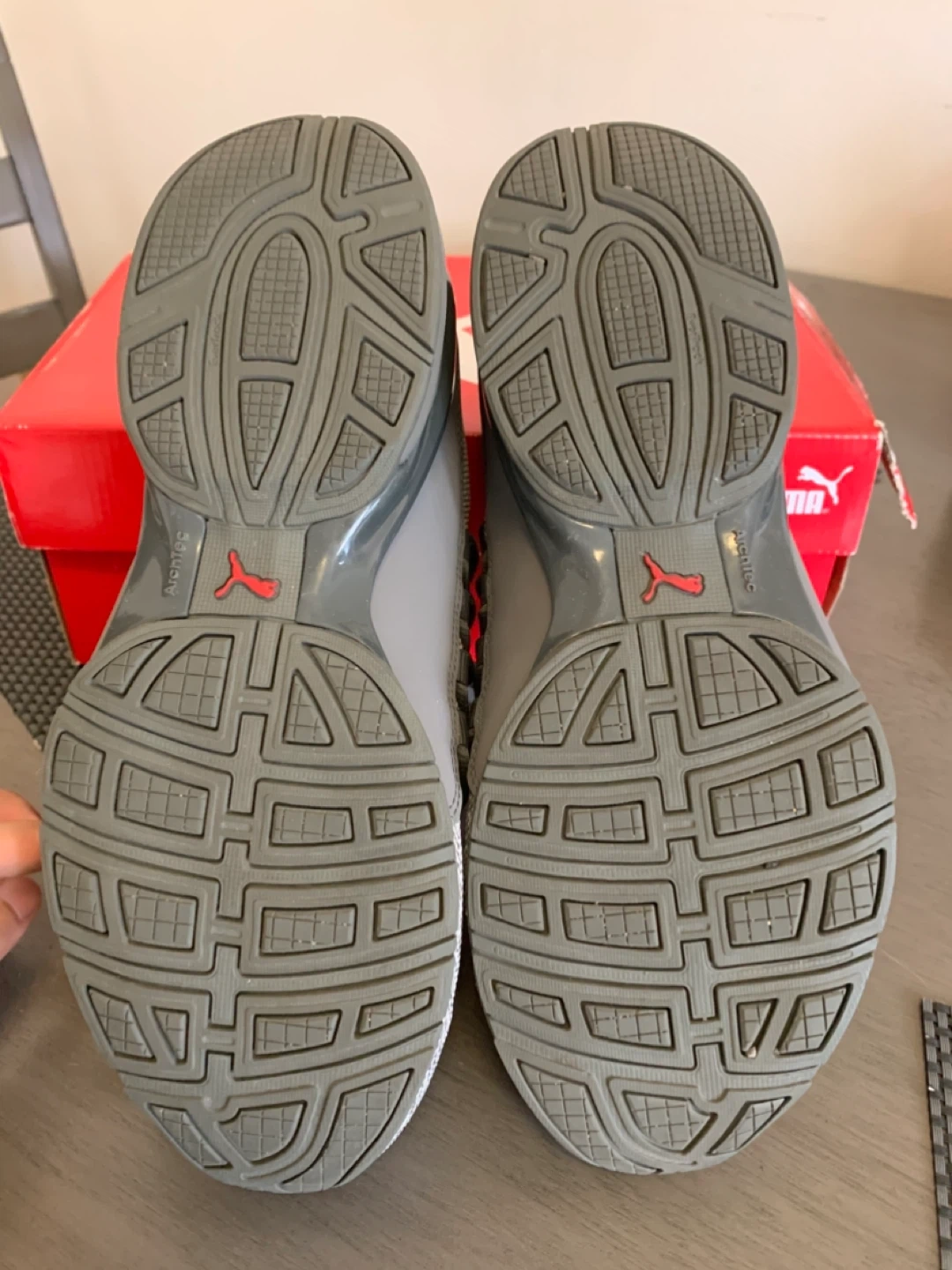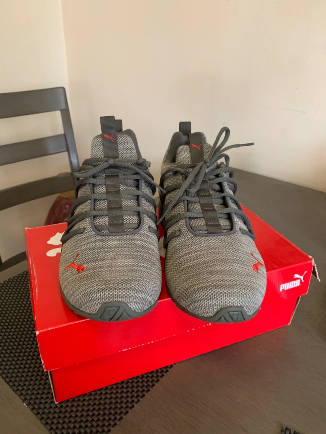 Selling a pair of Puma Axelion Refresh sneakers in size 8.5 US. They feature a stylish gray and red colourway. The shoes are in great condition and come with the original box!