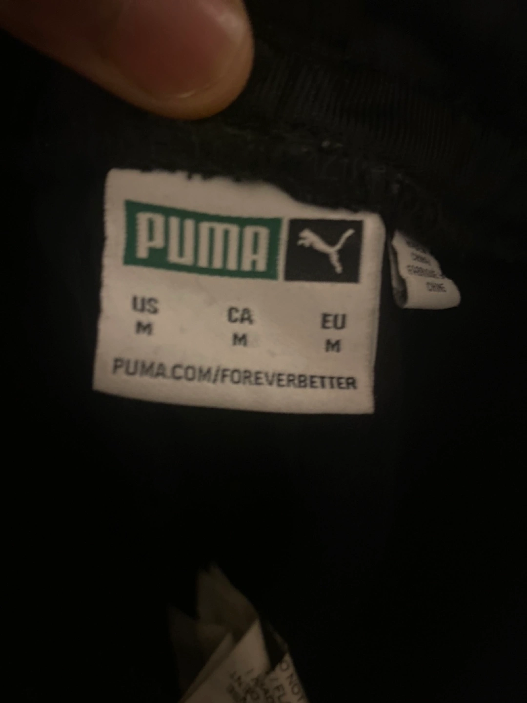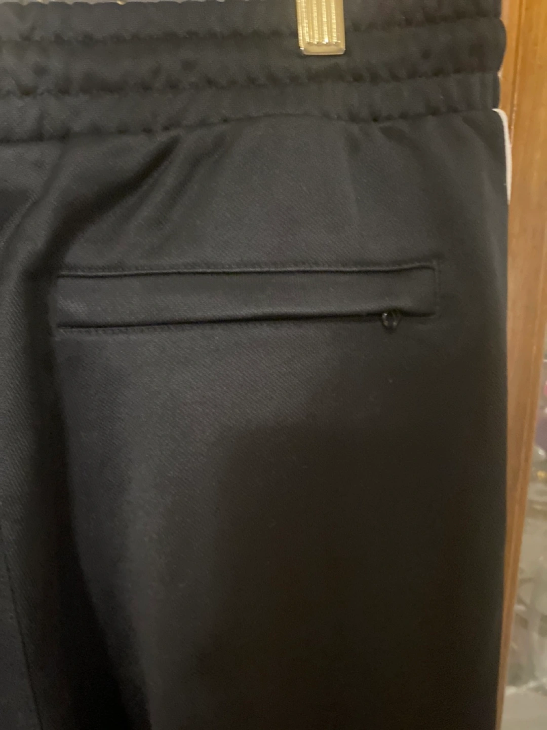 Men's black track pants. Size medium. White side stripes. Elastic waistband and cuffs. Zippered back pocket. Excellent condition. Cash only