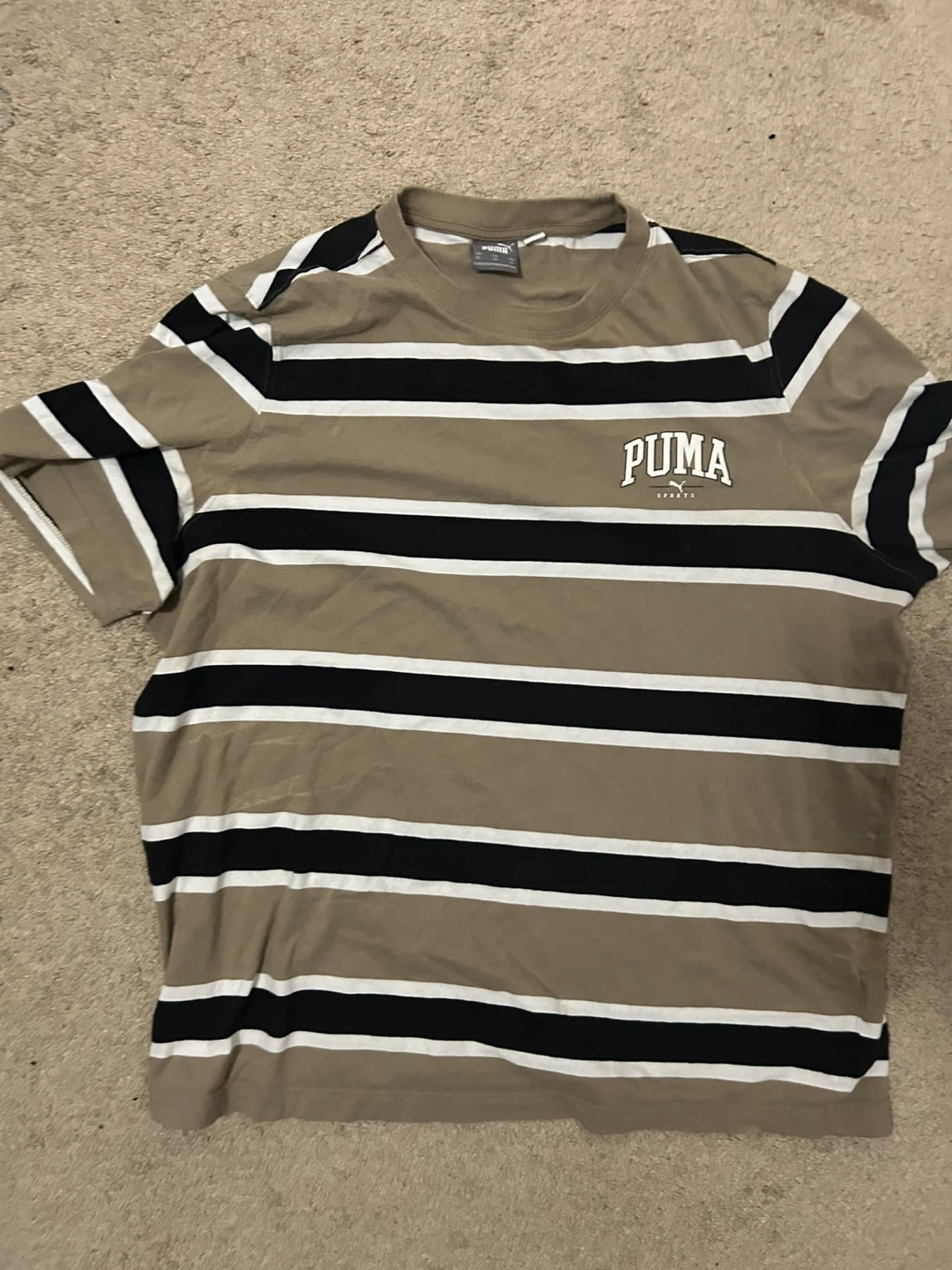 Selling a Puma t-shirt with a striped pattern. It features a combination of beige, white, and black stripes. The Puma logo is displayed across the chest. It's in good condition and ready for a new home!