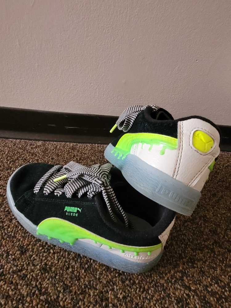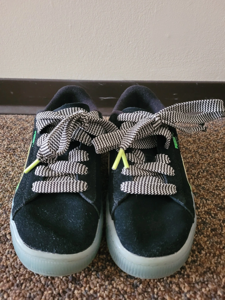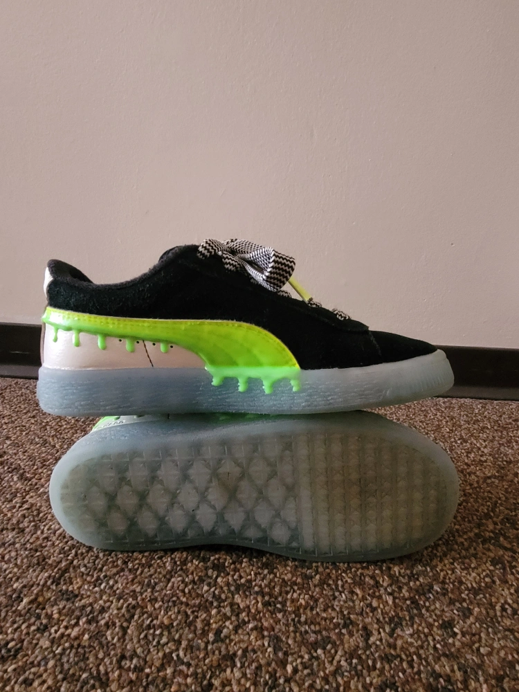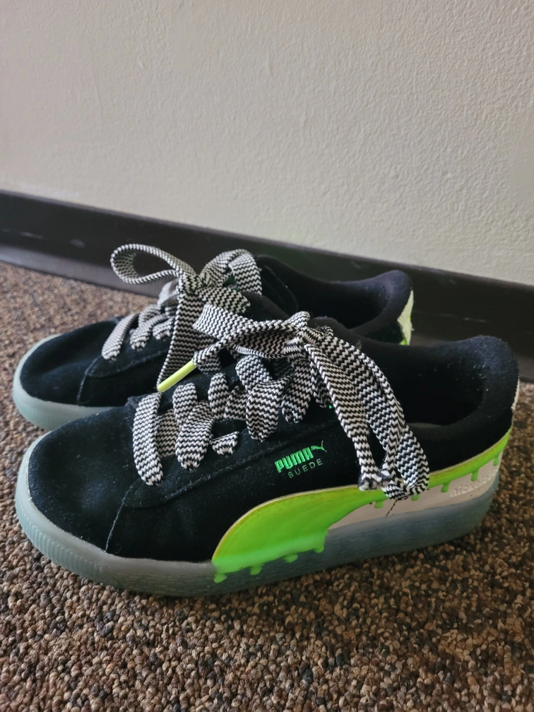 Selling a pair of Puma Suede sneakers in black with green accents! These are in great condition. The classic suede design is super stylish and comfortable, perfect for everyday wear. Size 2.5