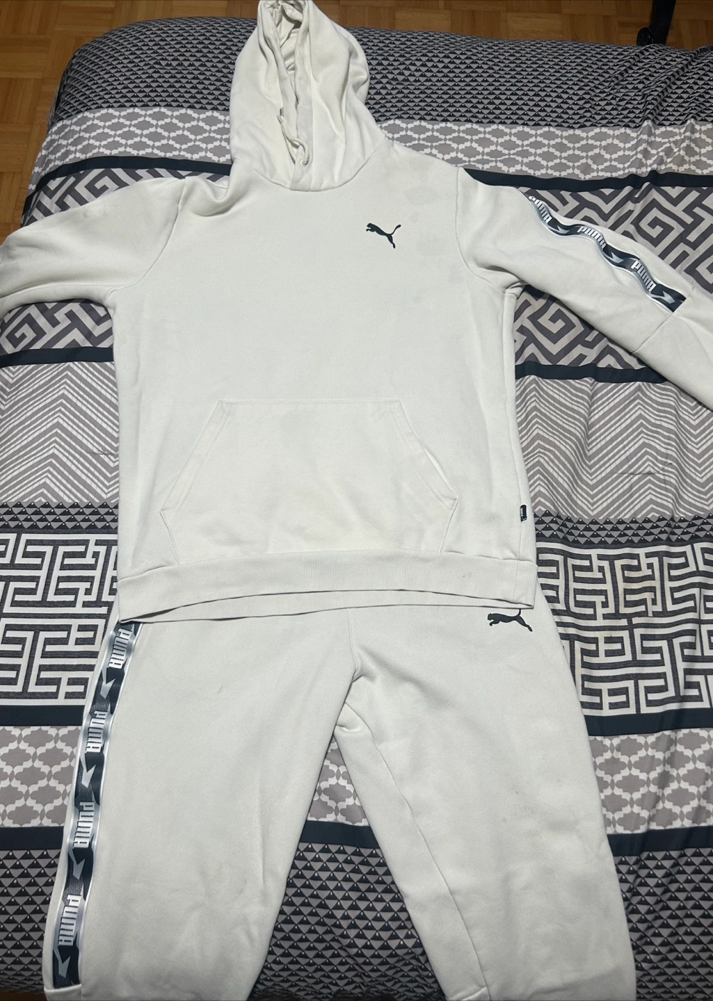 Off-white Puma tracksuit. Hoodie and sweatpants. Side stripes on sweatpants and sleeves.