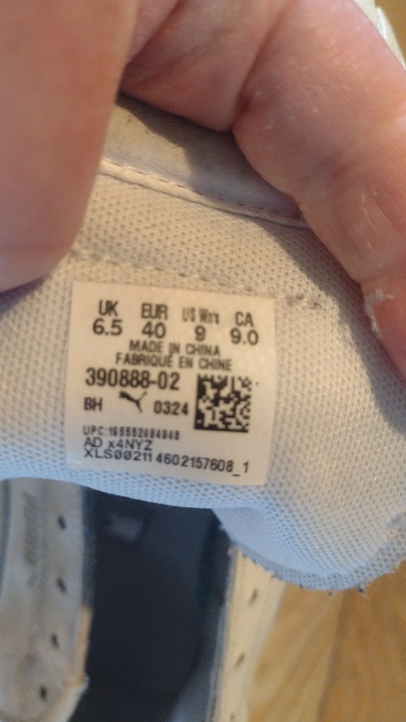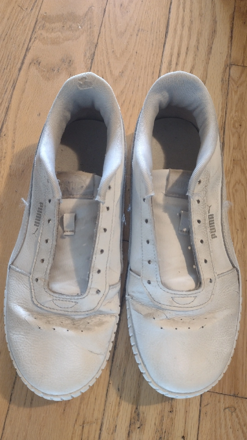 Selling a pair of Puma sneakers in women's size 9. They're white and have some wear, but still lots of life left! The style number is 390888-02.