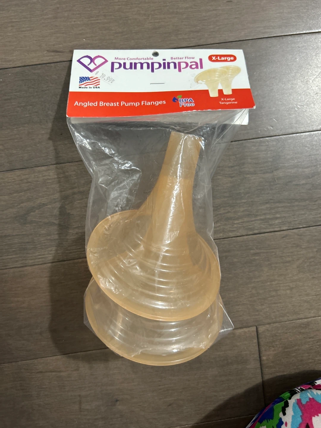 Selling a new set of Pumpin Pal angled breast pump flanges. They are X-Large and tangerine coloured. These flanges are designed to be more comfortable and provide better flow. They are also BPA free!