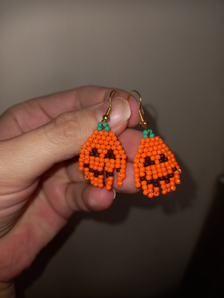 These are super cute pumpkin earrings, perfect for Halloween! They're handmade with tiny orange and orange beads. The earring hooks are gold coloured.