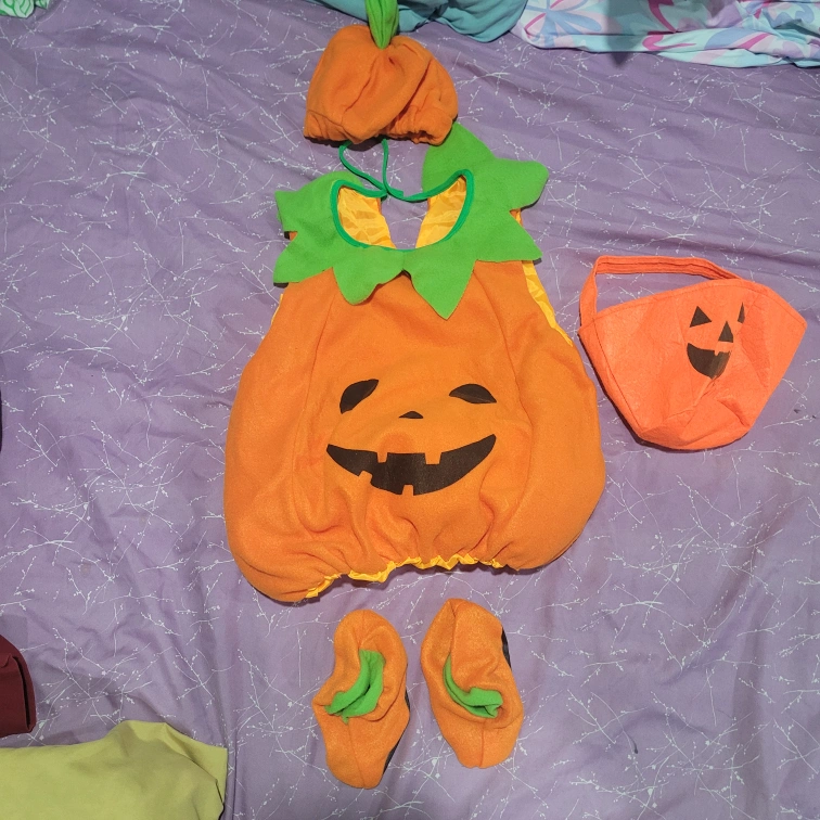 Get ready for Halloween with this adorable pumpkin costume! It comes with a matching hat, shoes and a cute little pumpkin-shaped treat bag. Perfect for your little one's Halloween adventures