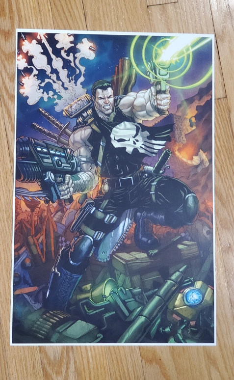 Here's a comic art print featuring The Punisher! It's a cool piece for any fan of the character or comic book art in general. The print is in great shape and ready to be displayed!