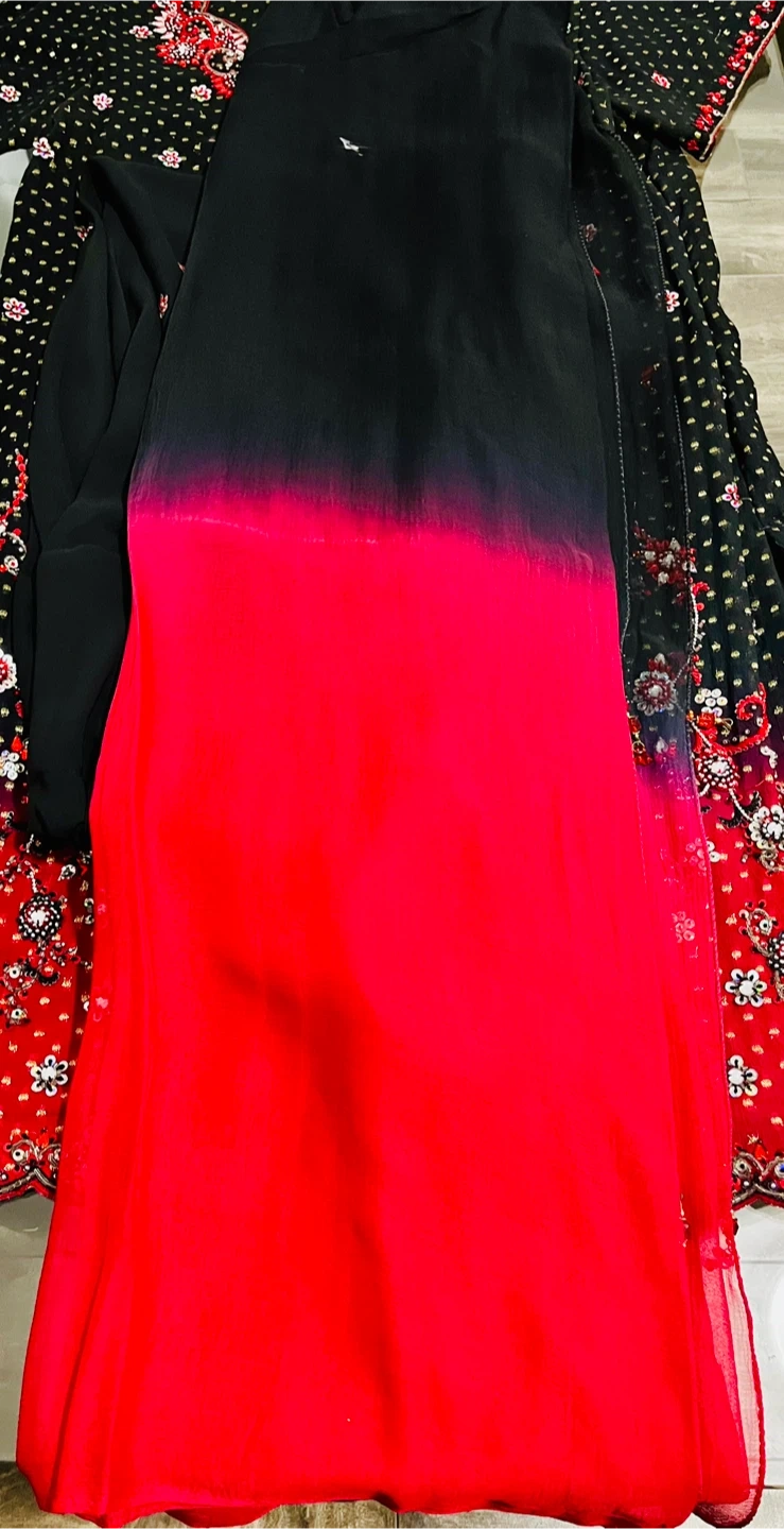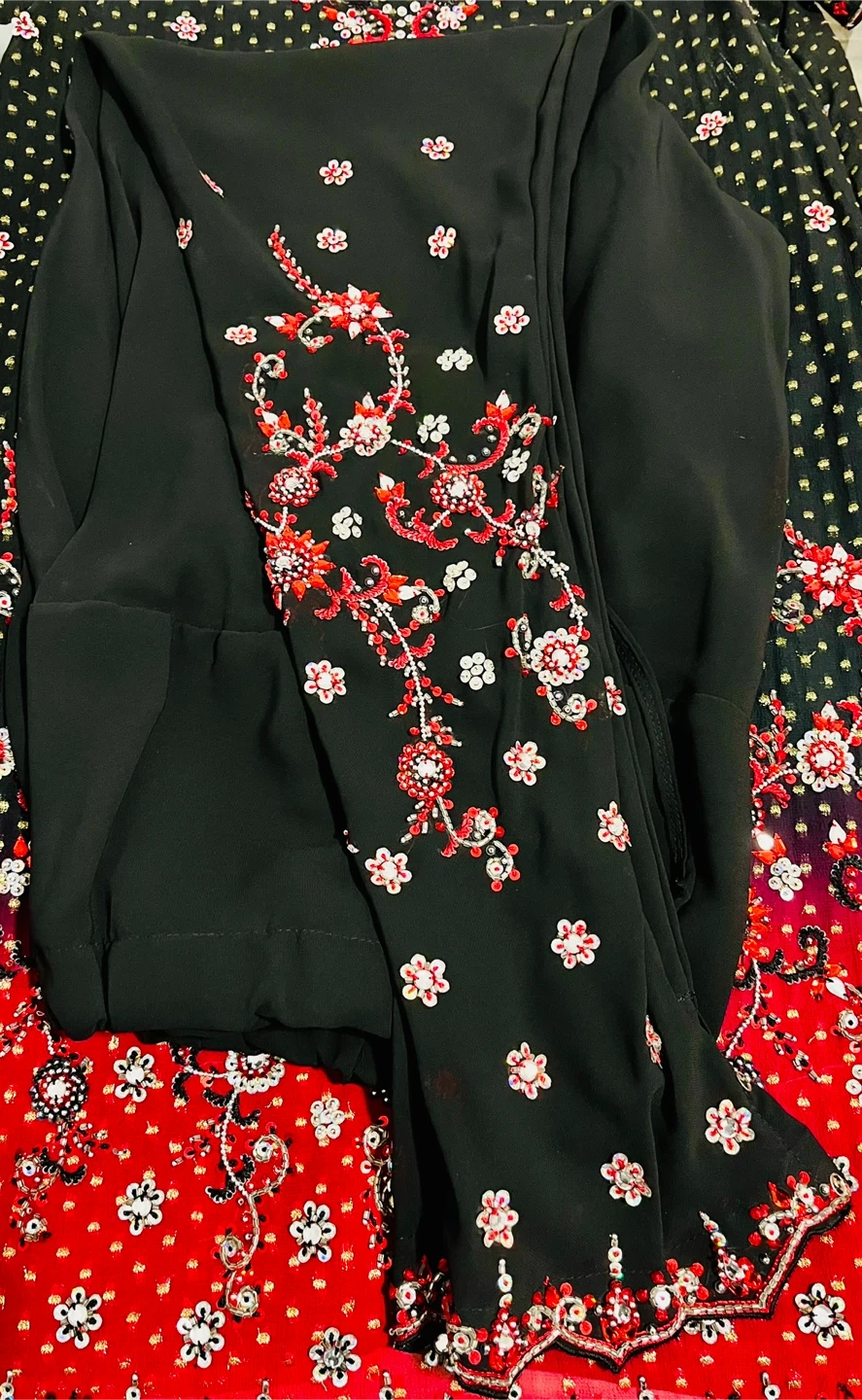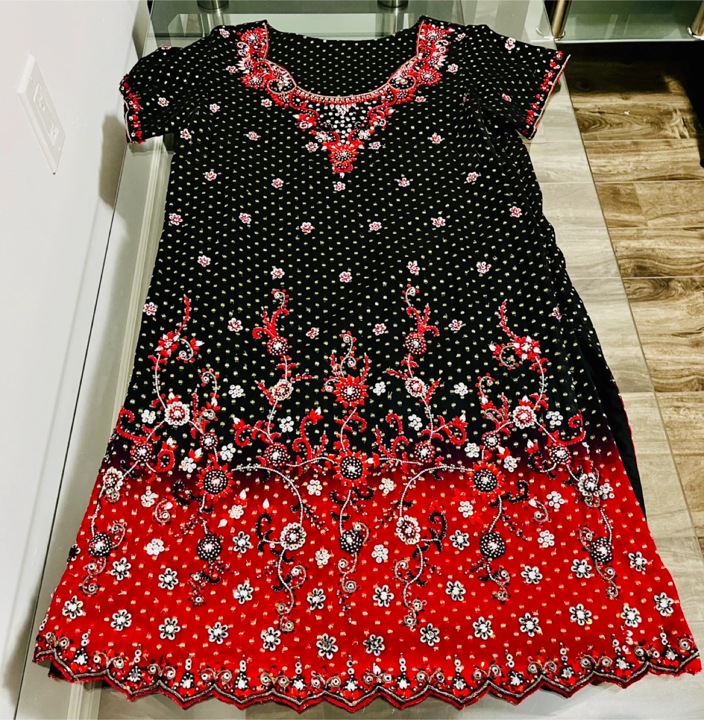 Punjabi suit- Churidar - Beautiful dress with floral embroidery in black and red. Perfect for a special occasion or a night out! The dress features intricate detailing and a comfortable fit. It's in great condition and ready for a new home