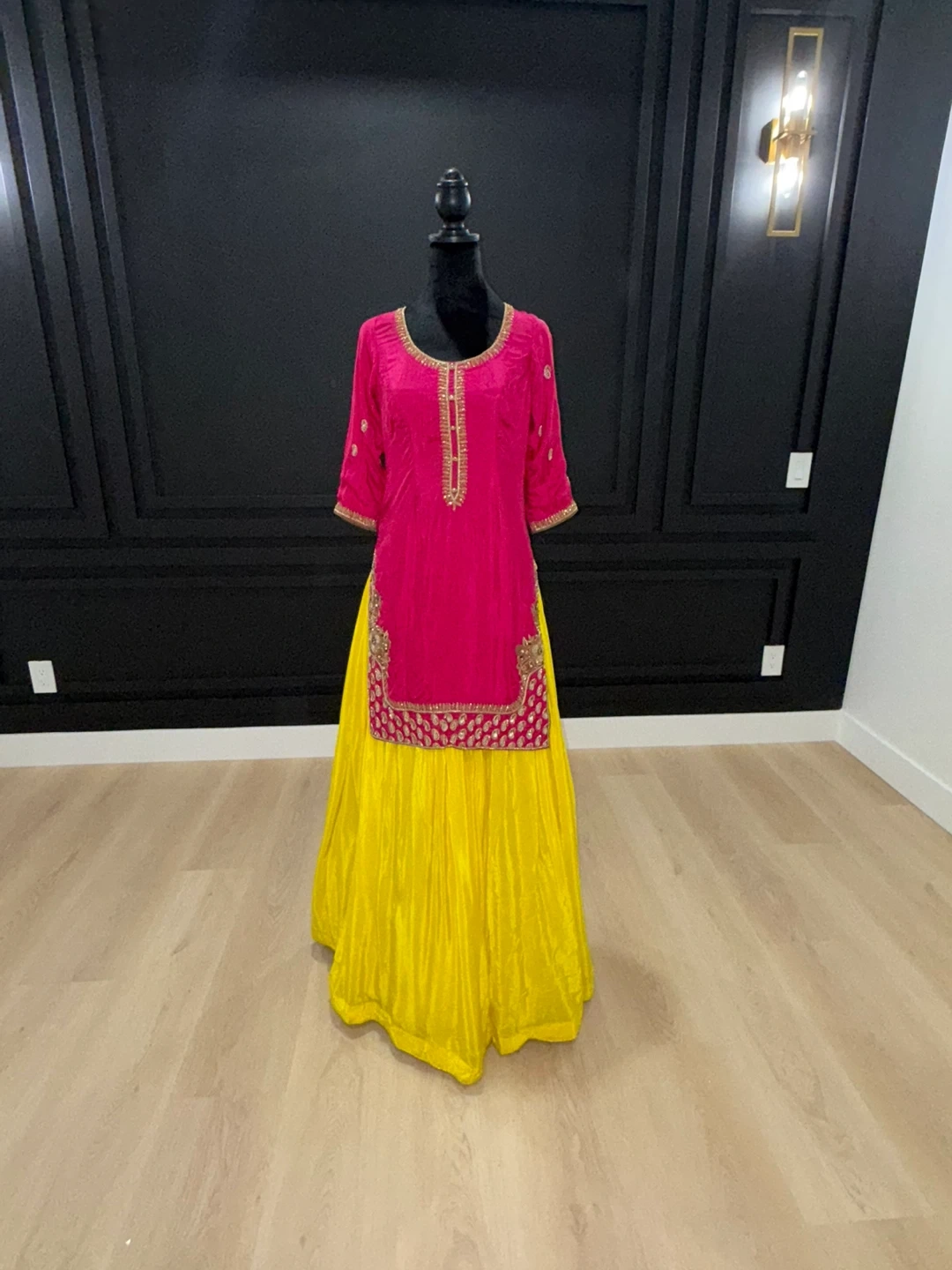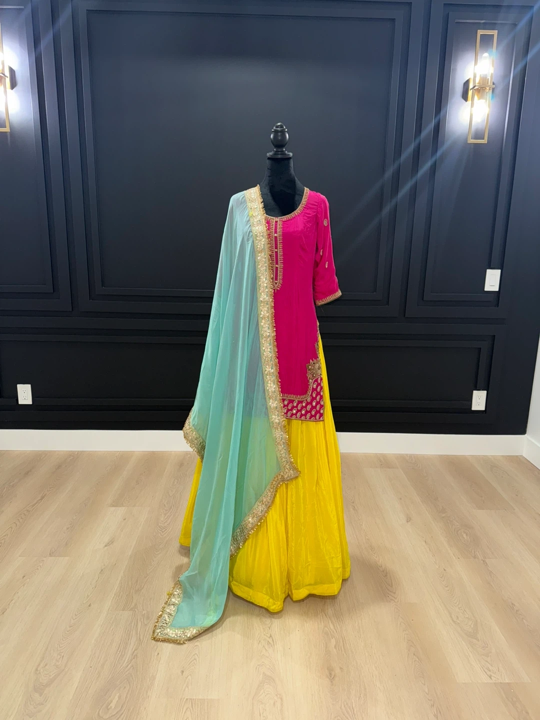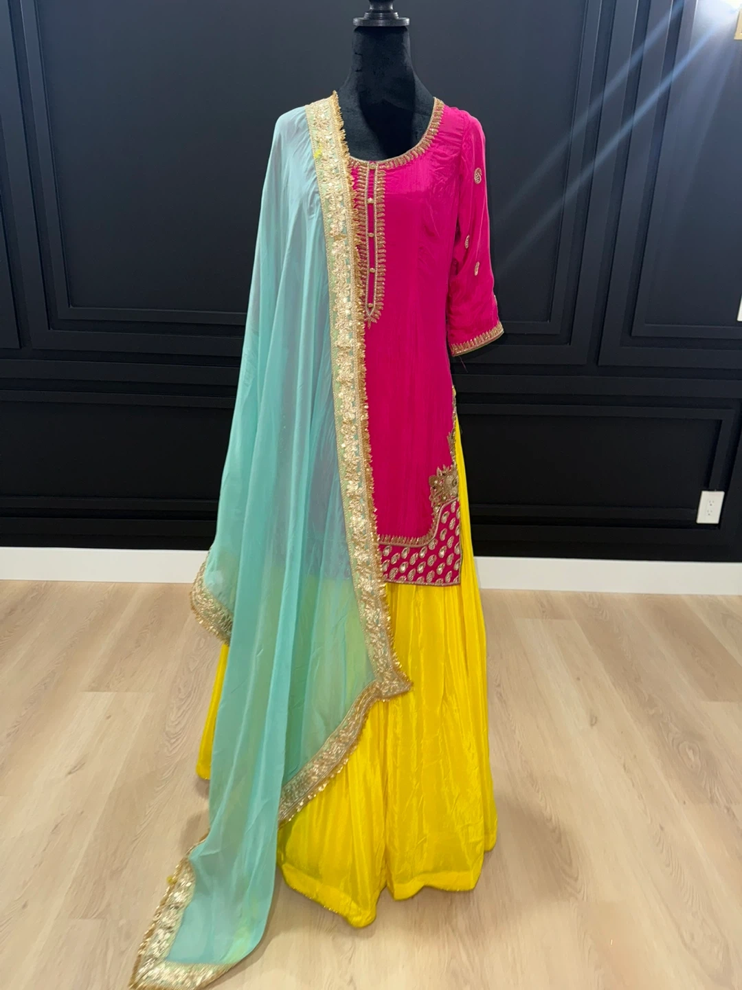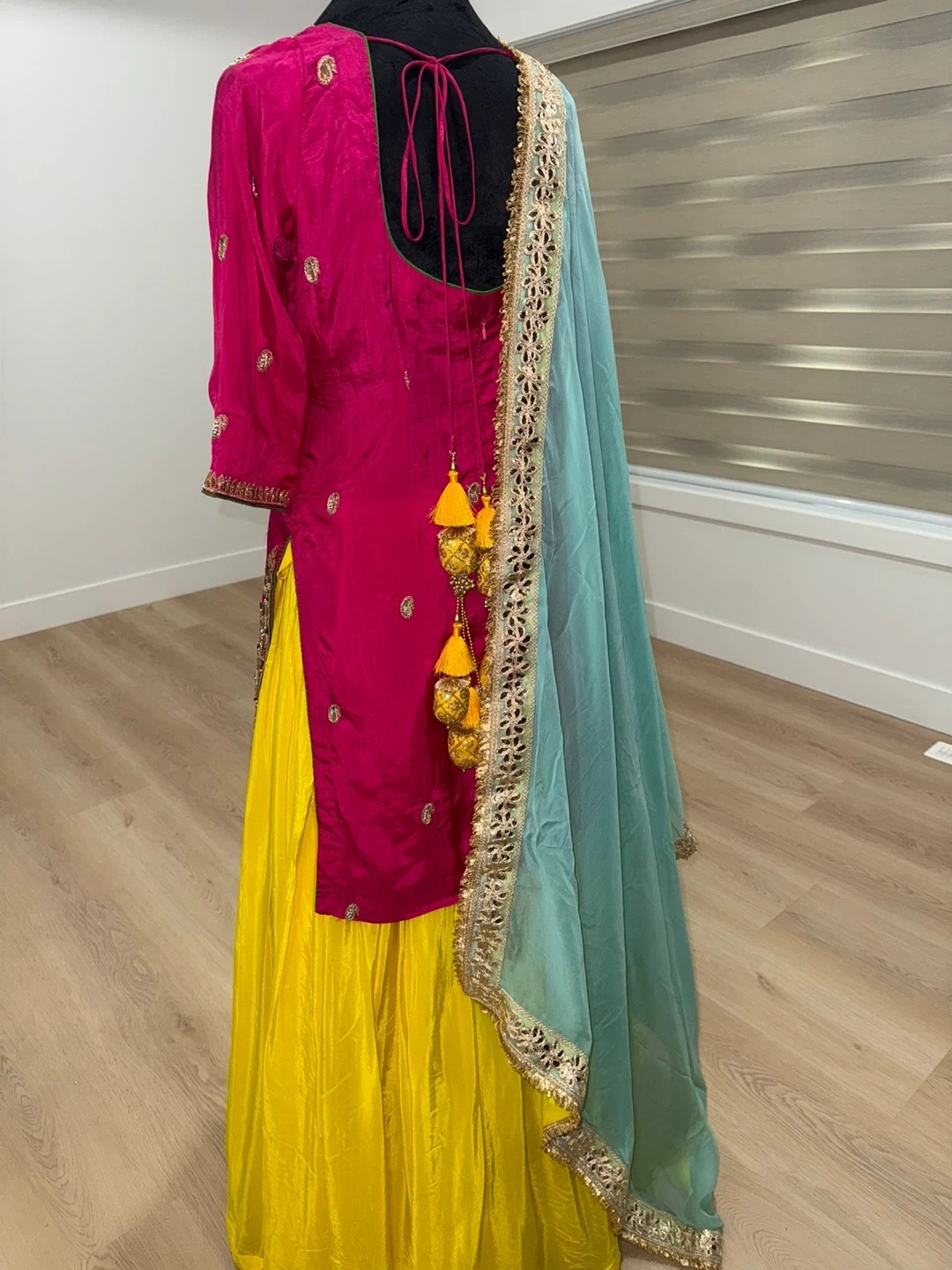 Beautiful Punjabi outfit in vibrant colours! The set includes a pink top, a yellow lehnga , and a blue dupatta. Perfect for a jaago event!!