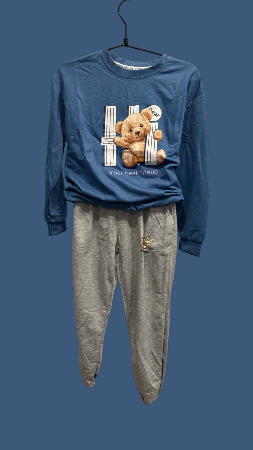 Cozy set featuring a cute bear design on a blue long-sleeve top and grey pants for Autumn.