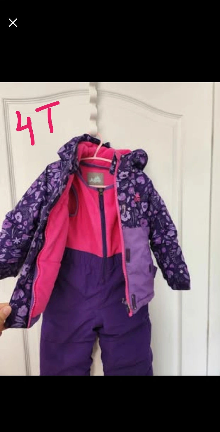 Selling a cute 2-piece snowsuit in size 4T! It's a lovely purple colour with a floral pattern on the jacket. Includes a zip-up fleece and snow pants to keep your little one warm and cozy this winter season