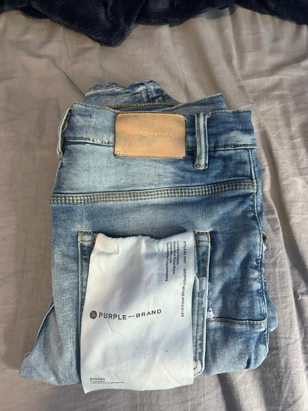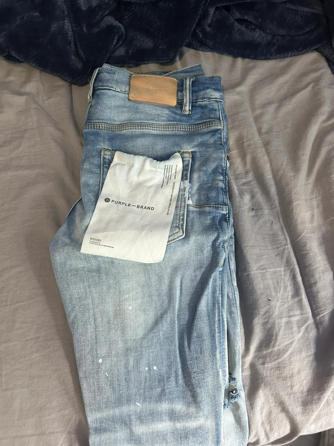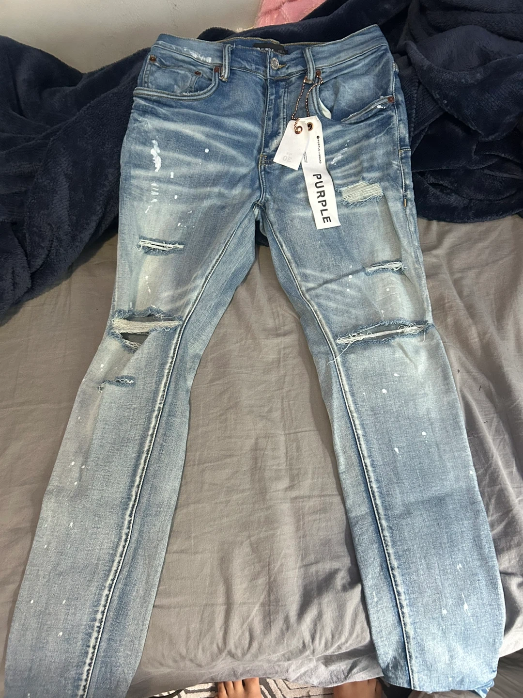 Selling a pair of Purple Brand distressed denim jeans in size 30. These jeans feature a stylish, worn look with intentional rips and paint splatter details. The jeans are in good condition and come with the original Purple Brand tag and pouch. Perfect for adding an edgy touch to your wardrobe!