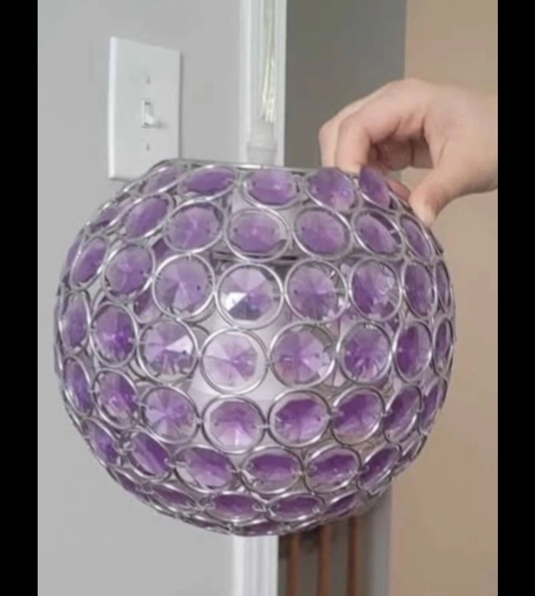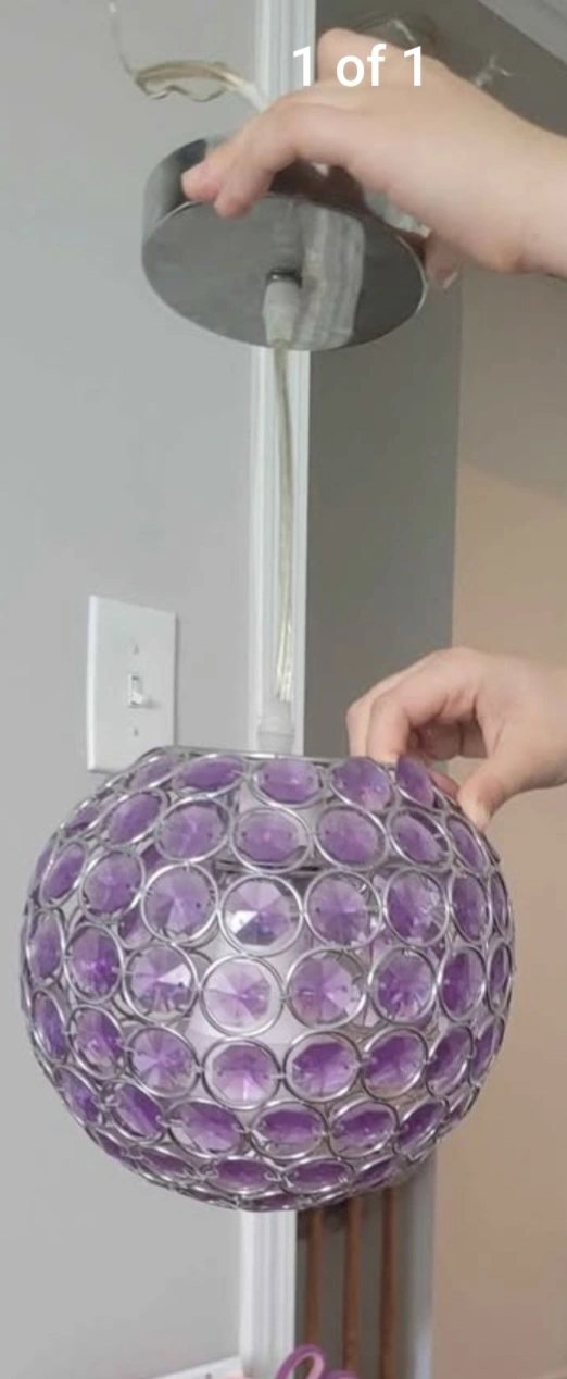 Add a touch of sparkle to your home with this unique purple crystal ball pendant light! The light features a round, silver-tone metal frame adorned with purple crystals. It's perfect for adding a pop of colour and a bit of glam to any room. ceiling light.