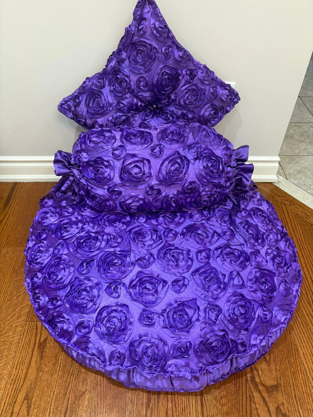 This is a beautiful purple floral decorative pillow set. It includes a round floor pillow, a lumbar pillow, and a square pillow. It's in great condition and would add a touch of elegance to any room!brand new