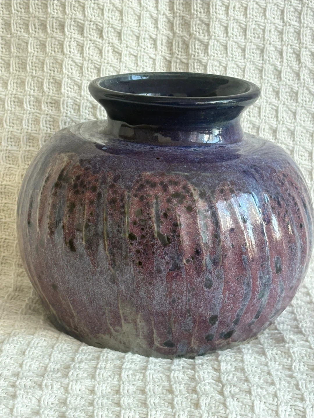 A beautiful purple glazed ceramic vase, perfect for displaying flowers or as a decorative piece in your home