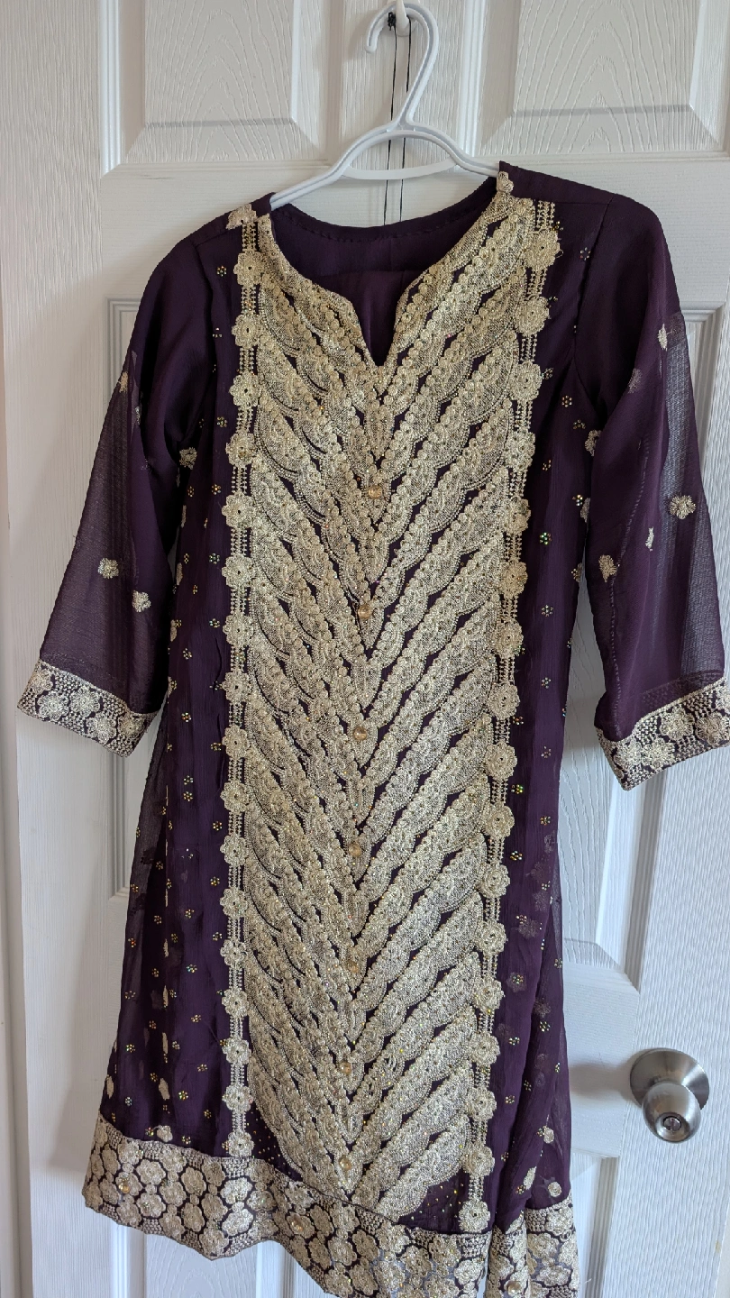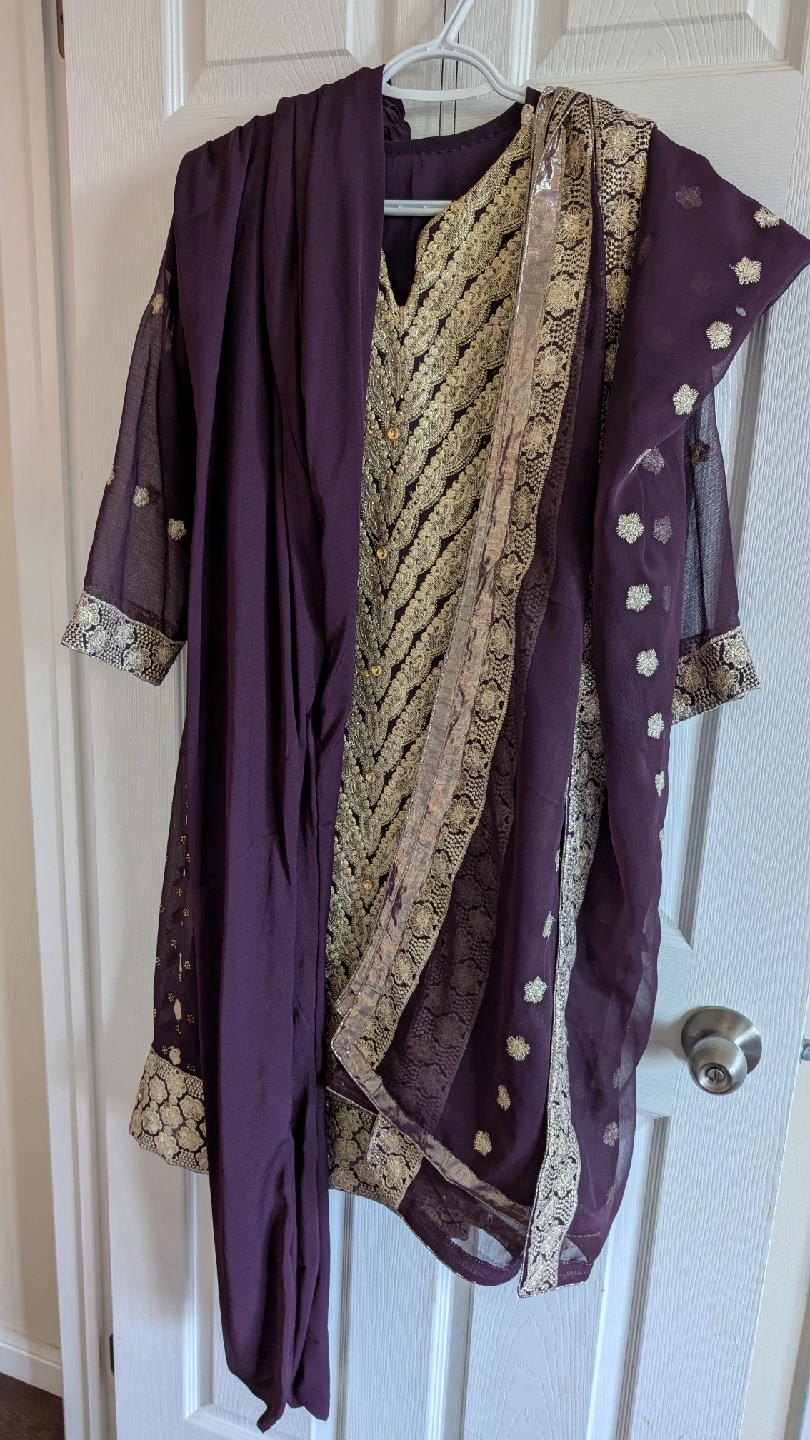 Beautiful purple and gold embroidered shalwar kameez. The intricate embroidery and detailing make it perfect for special occasions. It comes with a matching dupatta. The material feels lightweight and comfortable. Perfect for anyone looking for traditional attire!